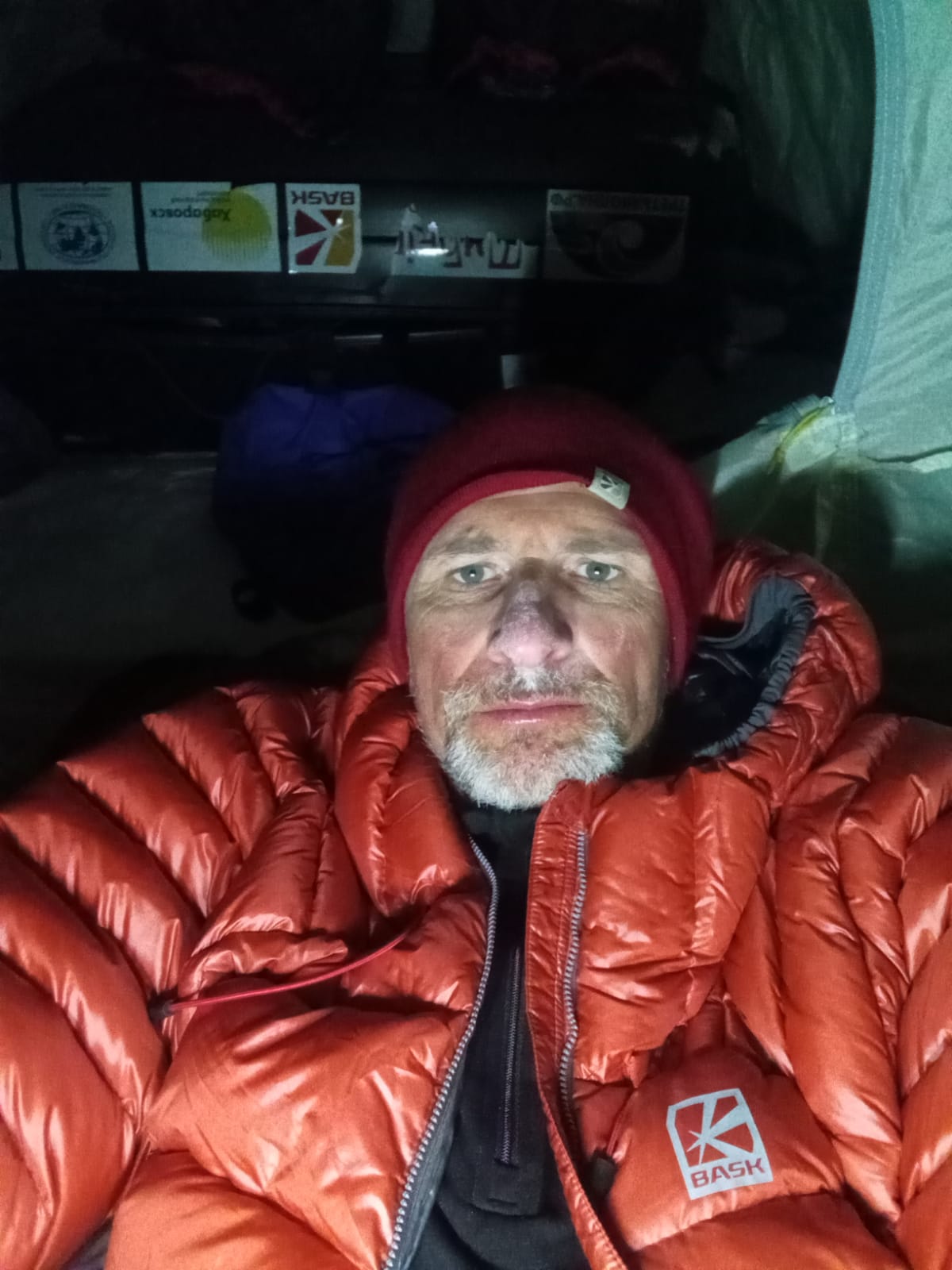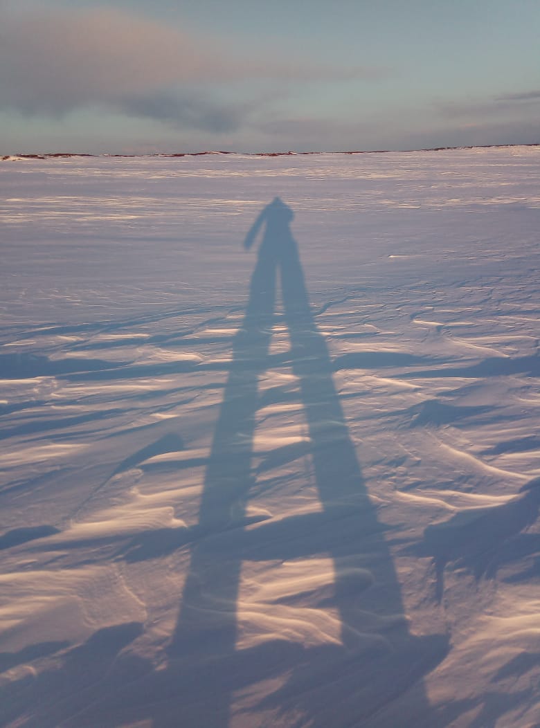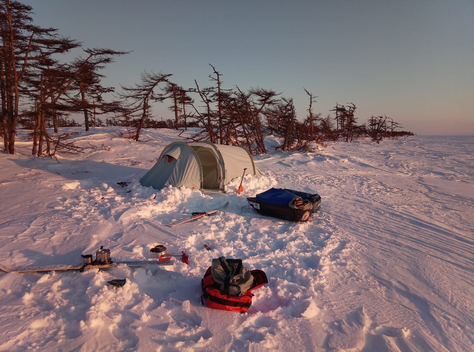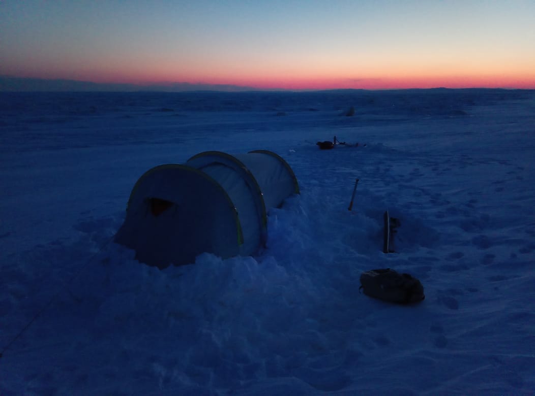 «Только я дошел до зимовья, на косу опустилась какая-то мгла, видимость всего метров 70-80. Повезло. Если бы мгла опустилась раньше, то я так и заблудился бы в центре залива. Мне снова, как обычно, везет. Только дошел до креста, начал фотографировать, и тут поднимаю глаза: даже солнца не видно. И стремительно стало темнеть. Пришлось очень быстро ставить лагерь. Подготовил основание для палатки (если не окопать ее, то может сдуть, тут такие сильные ветра), долго рыл яму, потом, наконец, поставил палатку, поел хлеба с салом, запил чаем из термоса и лег спать. В целом день удался».