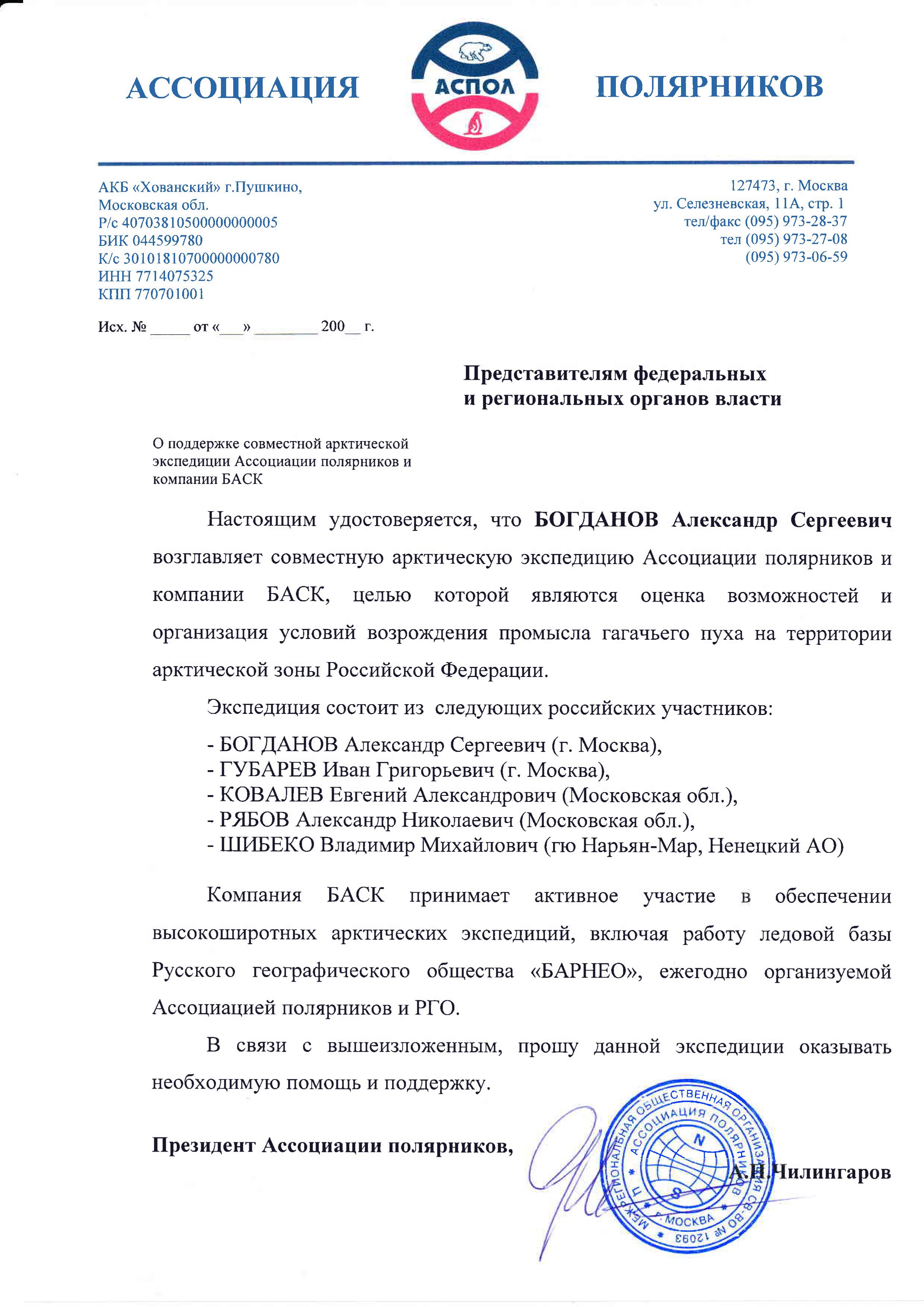 «Компания БАСК принимает активное участие в обеспечении высокоширотных арктических экспедиций, включая работу ледовой базы Русского географического общества “Барнео”, ежегодно организуемой Ассоциацией полярников и РГО. В связи с вышеизложенным прошу данной экспедиции оказывать необходимую помощь и поддержку».