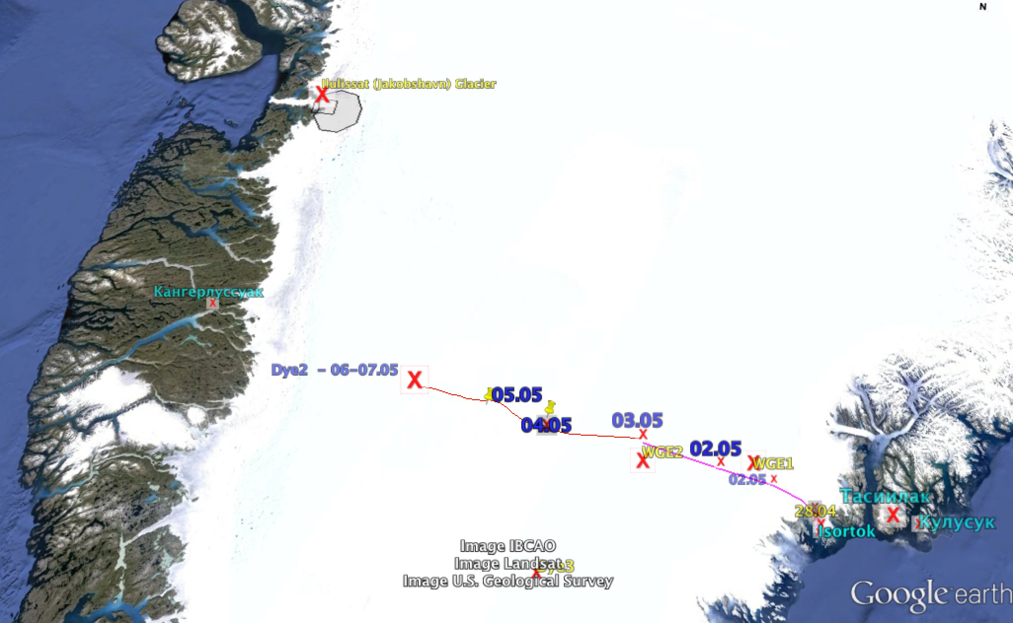 ПД: “Ура! Парни на DYE-2. Сейчас в 2 часа утро (7 мая) по Гренландскому времени получил сообщение: "Мы на dye2.SSW 4-5 м/с. Тонкая облачность BKN. T-10.Все хорошо!”