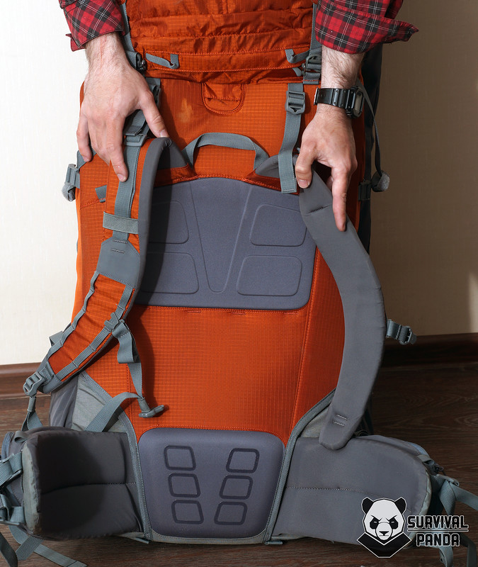 Что касается ношения, то благодаря такой компоновке получается две точки касания тела: в поясничной части и в районе лопаток. Воздушный зазор для вентиляции обеспечивается за счет прогиба алюминиевых лат. Кстати, для правильной подгонки производитель крайне рекомендует подгибать их под себя. А также их можно вообще вынуть для экономии веса. При этом жесткость будет поддерживать пластина из ПЭ в спине.