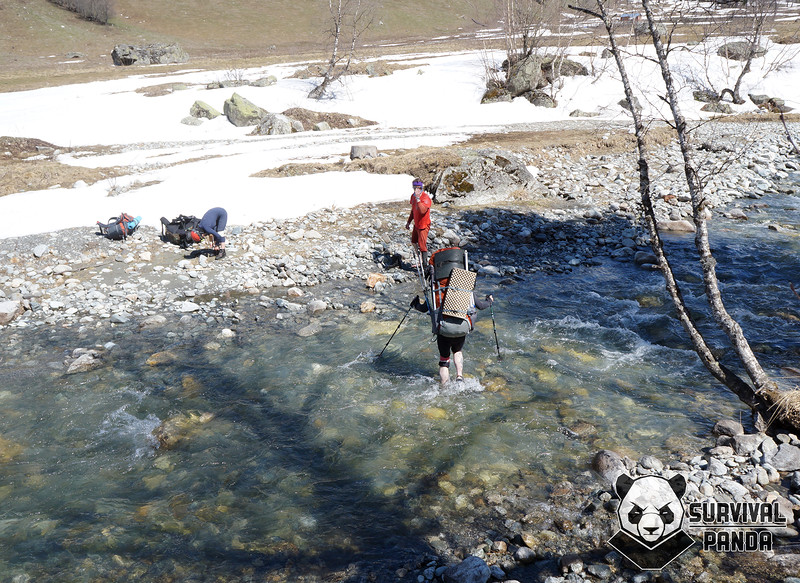 Переправа через ручей. До этого, на спуске, девушка получила травму и мы ее разгружали. В результате в боковых карманах у меня оказалось: