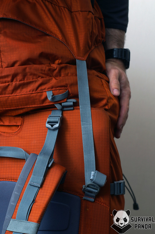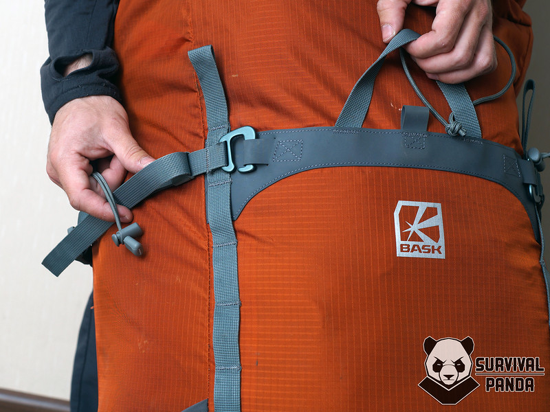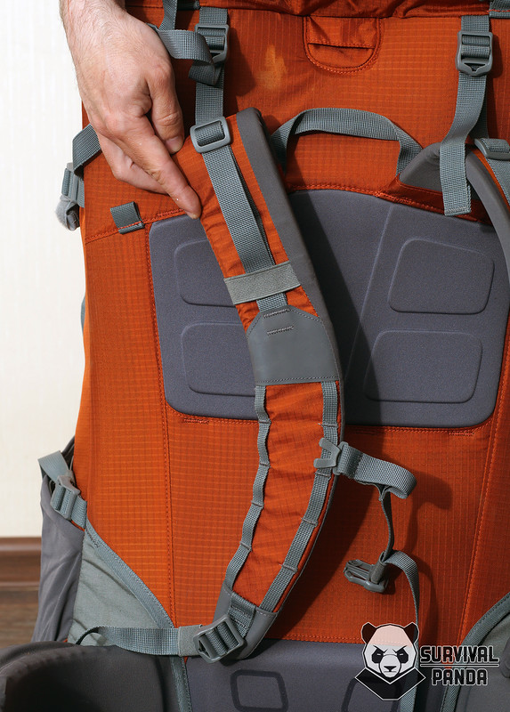Стропы регулировки длины и стропы противооткидов включены в общую систему жесткости лямки с помощью накладок из хайпалона и стропы крепления навесного оборудования идущей по краям. Благодаря этому я без особых опасений поднимал груженый рюкзак за лямку, чтобы накинуть на плечи.