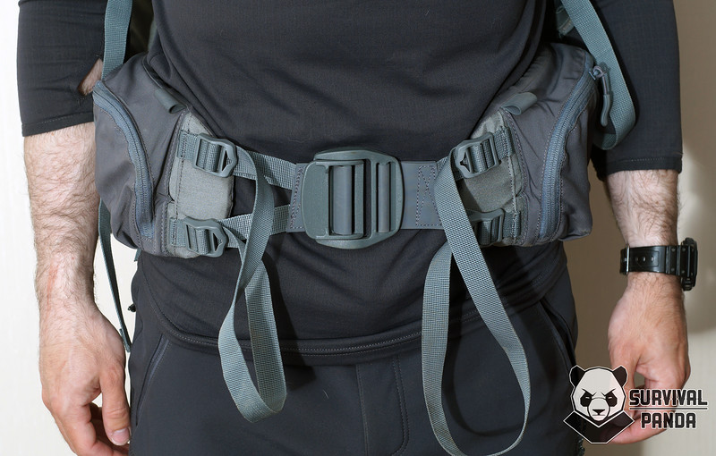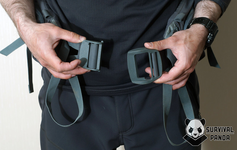 Затяжка происходит движением рук "к себе" и тут есть сразу несколько особенностей. Для утяжки служит не одна трехщелевка, как обычно, а две. В результате пояс идеально садится на бедра под правильным углом. Да и тянуть за петлю из стропы гораздо удобнее.
