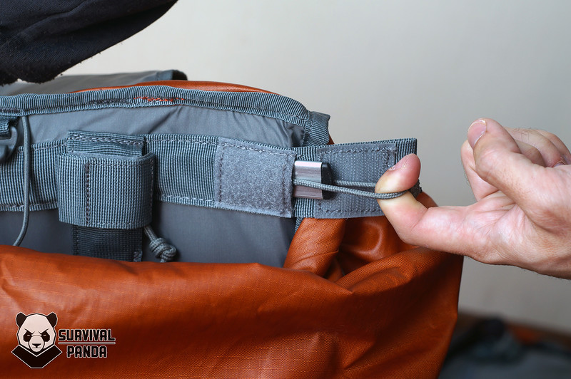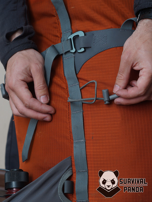 Кроме штатной петли, крючок можно цеплять за любой участок прошитой стропы, которая проходит по всей длине фронтальной поверхности. Вот например, на заглавной фото так закреплен ледоруб.