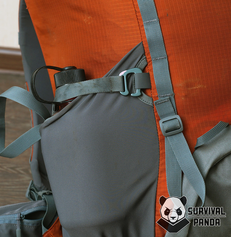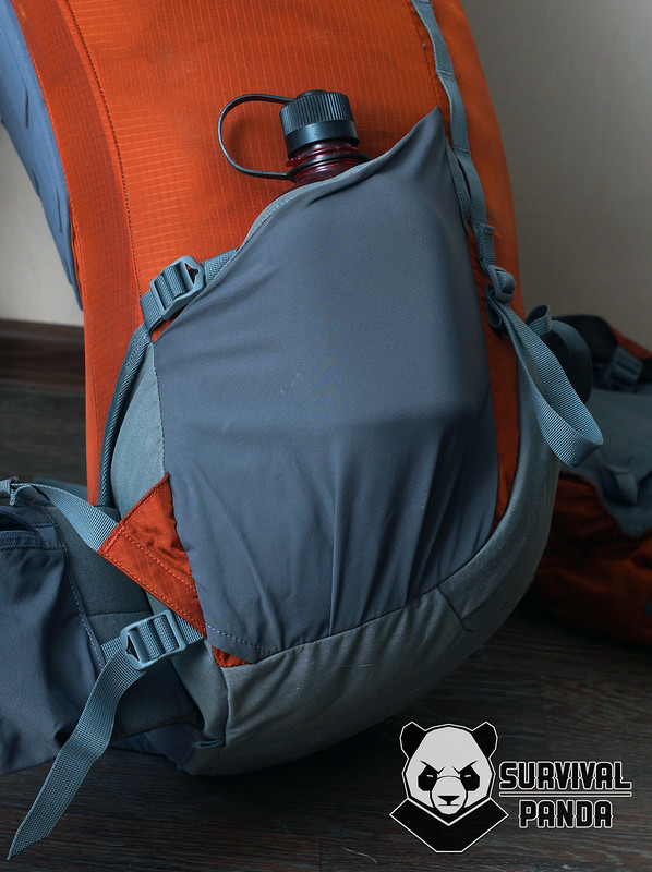 Размер карманов действительно впечатляет. Вот напрмиер литровая фляжка не занимает и трети их объема. Обратите внимание - в нижней части есть небольшое отверстие для отвода влаги.