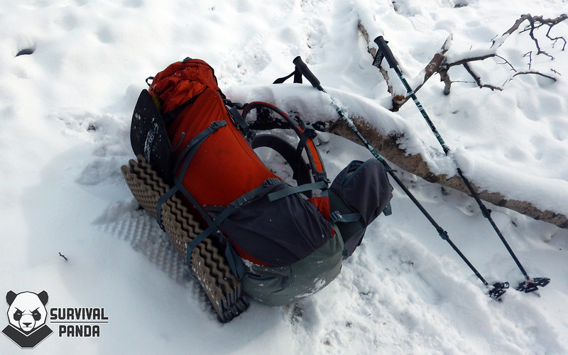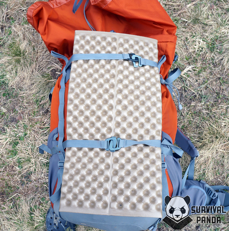 Общей длины утяжек с запасом хватает чтобы закрепить по пенке с каждой стороны, но лично я использую другую их особенность. Продев сквозь петли из стропы их можно вывести на фронтальную поверхность. И уже к ней цеплять коврик (в моем случае z-lite), сноуборд, лыжи, снегоступы или штурмовой рюкзак (эта фото уже была выше).