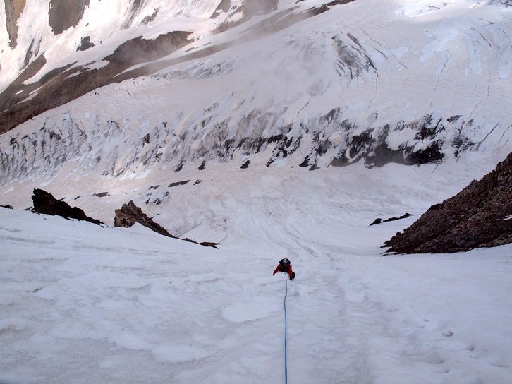 Сходили также на вершину, которая стоит прямо перед пиком Пограничник. Получилось нормальное восхождение: внизу веревки три почти вертикального льда, затем более пологий участок в 45° и скальная вершинная башня.
