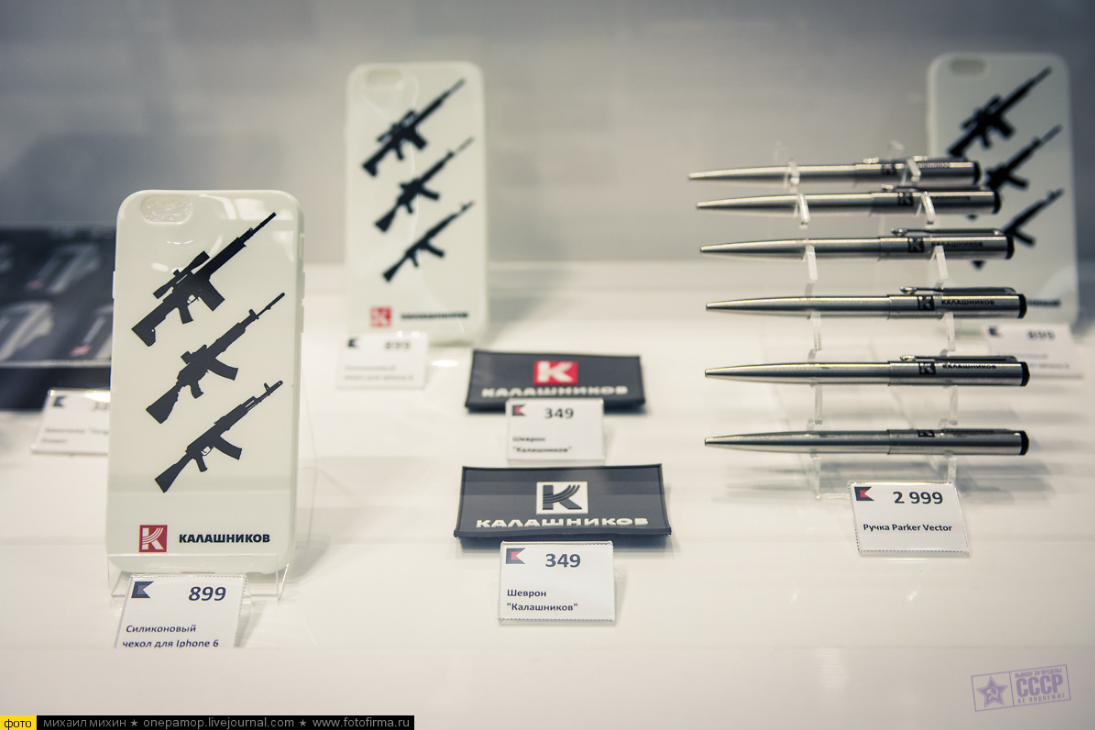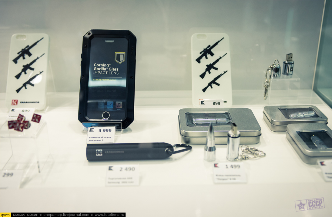 Фирменная сувенирная продукция «Калашникова», представленная в магазине.