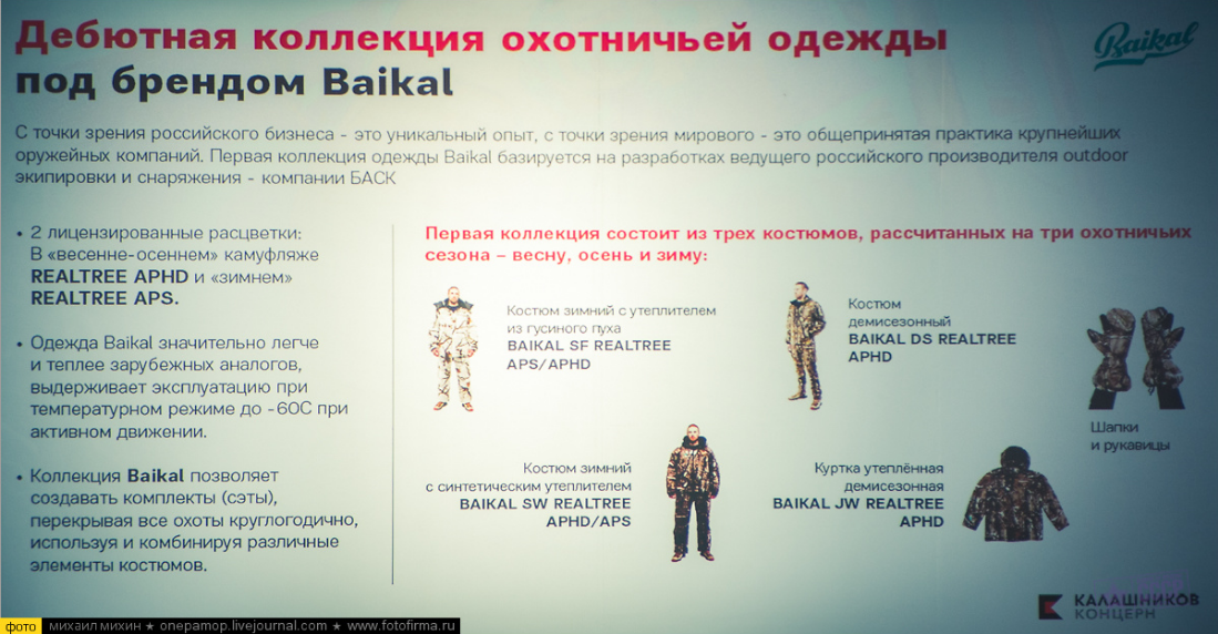 .."16 августа 2016 года стал свидетелем небезынтересного события: в терминале «Аэроэкспресс» московского аэропорта Шереметьево концерн «Калашников» открыл первый в России собственный магазин товаров, не требующих лицензирования. В дополнение к «оффлайновому» магазину был немедленно запущен и онлайновый — shop.kalashnikov.com, а также случился краткий предпоказ дебютной коллекции фирменной охотничьей одежды Baikal.