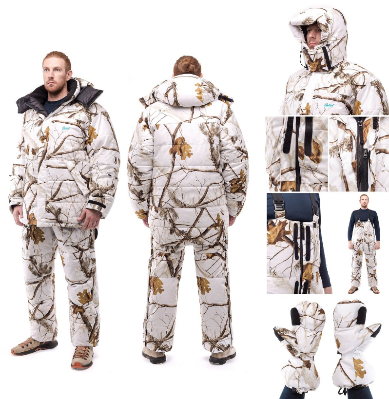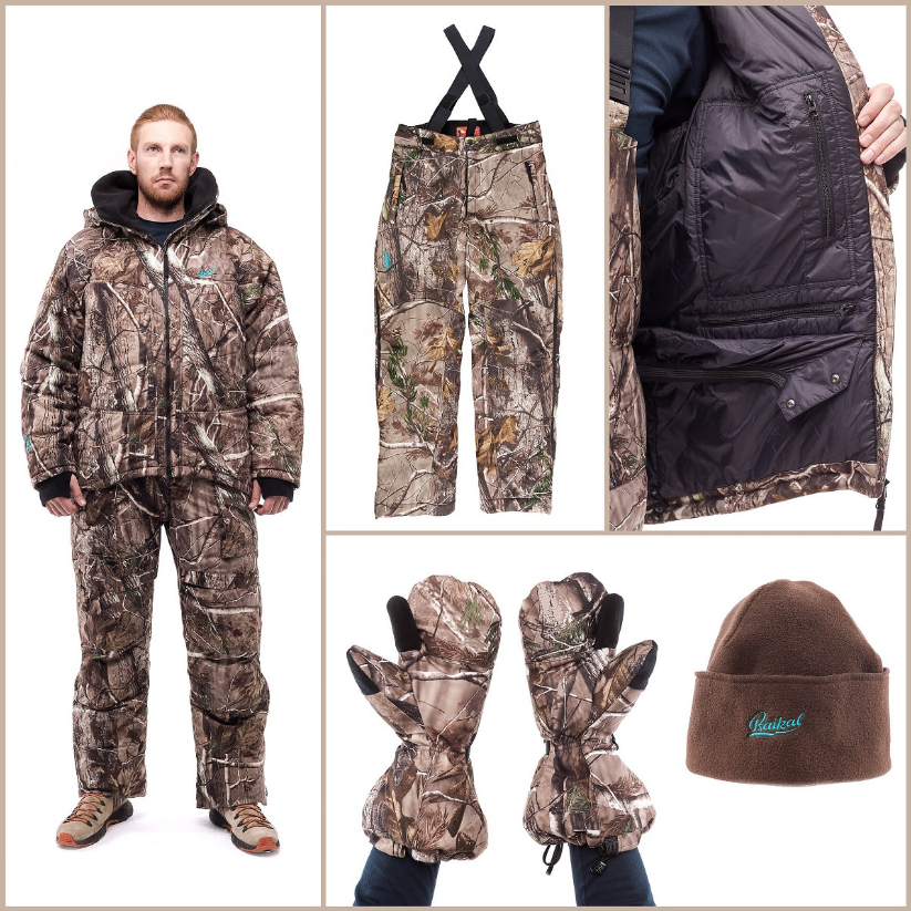 Так, специально для засидочной охоты разработан практичный зимний костюм с утеплителем из гусиного пуха BAIKAL SF REALTREE APS/APHD. При условии активного движения костюм способен согреть охотника даже при температуре до -60С.