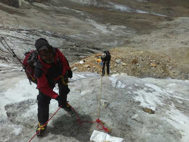 Индийская армия рубится на своём маршруте. У них интересная тактика: абсолютно весь маршрут, включая горизонтальные участки, провешены веревками. Веревки бывают либо альпинистские, либо из плетеной лески очень ярких цветов. Говорят, они одноразовые.