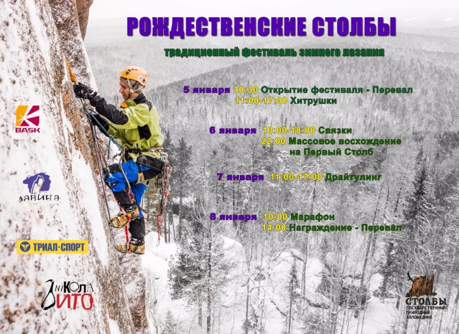 В программе фестиваля c 5 по 8 января: зимний боулдеринг, лазание в связках, драйтуллинг, кросс по Столбам с элементами лазания (Столбовский биатлон), ну и конечно же, пельмени, глинтвейн, горячий чай и море позитива.