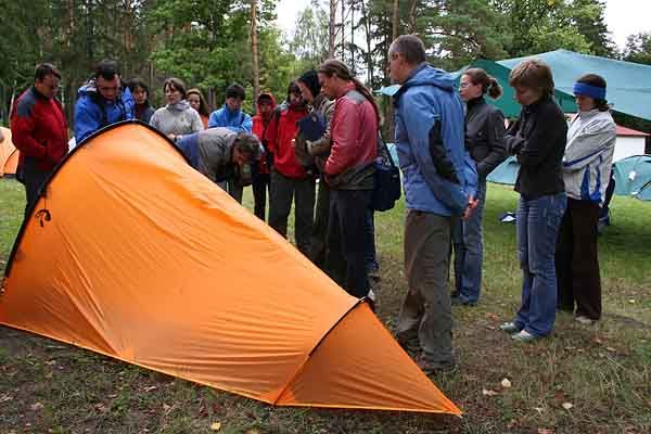 Знакомство с палаточной продукцией прошло под открытым небом, на лужайке, где над палаточным лагерем развевался флаг БАСК. Небольшой дождь не смутил конструктора–технолога Алексея Рябченко, получившего дополнительную возможность протестировать свои творения. Его новое изобретение - очень легкая 2-х килограммовая палатка Wing экстремальной серии - завладела вниманием слушателей.