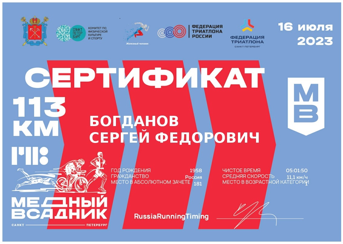 А еще ликует, что команда Masters Triаthlon Team, в составе которое выступал в Питере, показала отличные результаты, заняв I место в командном зачете. «Всего в нашей команде приняли участие 14 человек, на которых пришлось шесть золотых, две серебряных и две бронзовых награды», – гордится С.Богданов. «Наш одноклубник Борис Кириллов успешно прошел дистанцию в возрасте 88 лет! Это – мировой рекорд возраста на половинной дистанции. До этого рекорд принадлежал японцу Хирому Инада (Hiromu Inada), которому удалось уложиться в лимит времени в 85 лет на той же дистанции», – делится эмоциями наш командор.