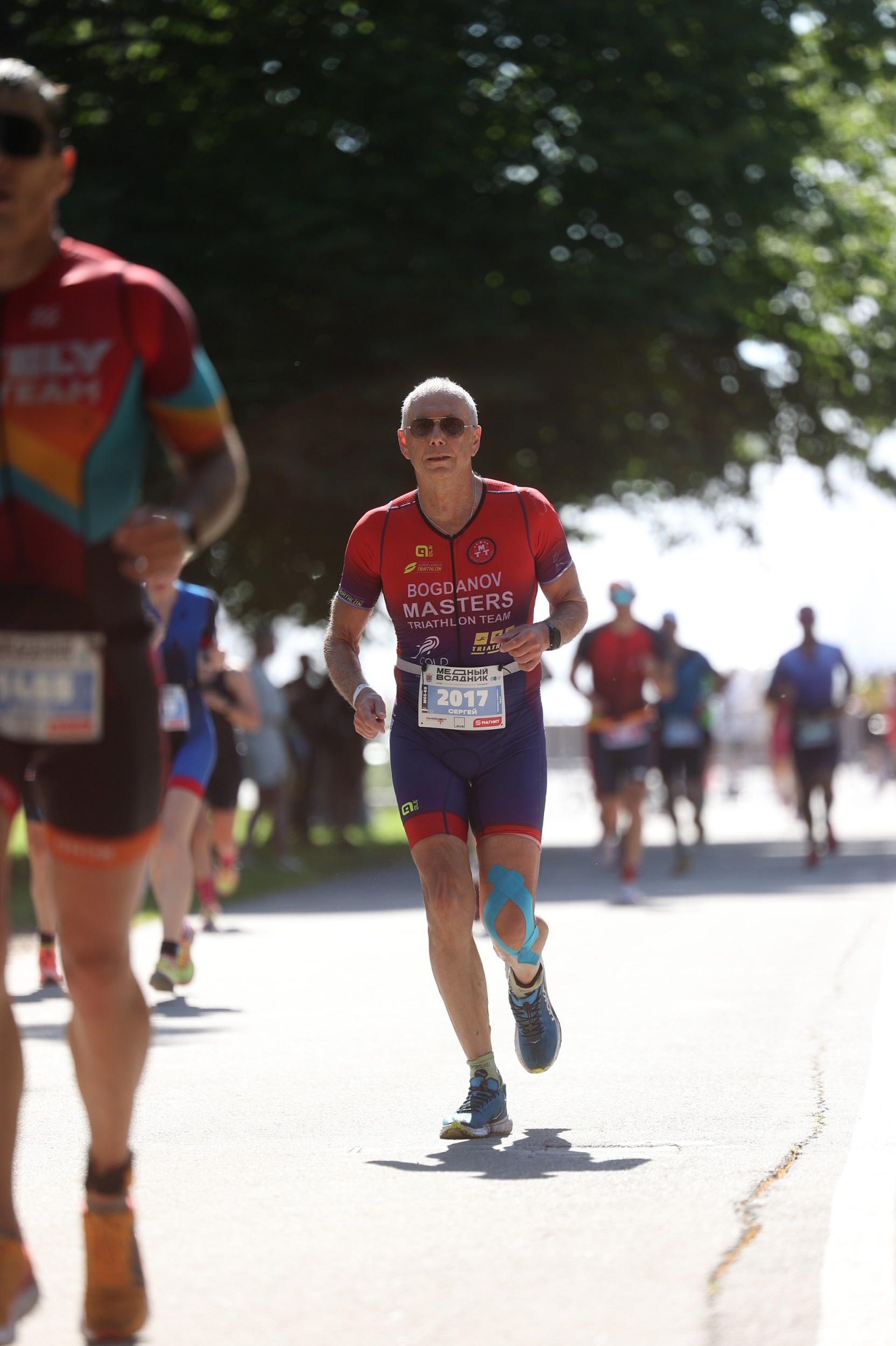 Чемпионат России и соревнования по триатлону среди любителей на средней (1,9 км плавание + 90,1 км велогонка + 21,1 км бег) дистанции проходил 16 июля. Плавательный этап – на Гребном канале, велосипедный – по Западному скоростному диаметру, беговой – в Приморском парке победы и по ЦПКиО им.Кирова. Как вспоминает С.Богданов, «в день соревнований была идеальная теплая погода – +26С с не очень сильным ветром, что не характерно для Питера».