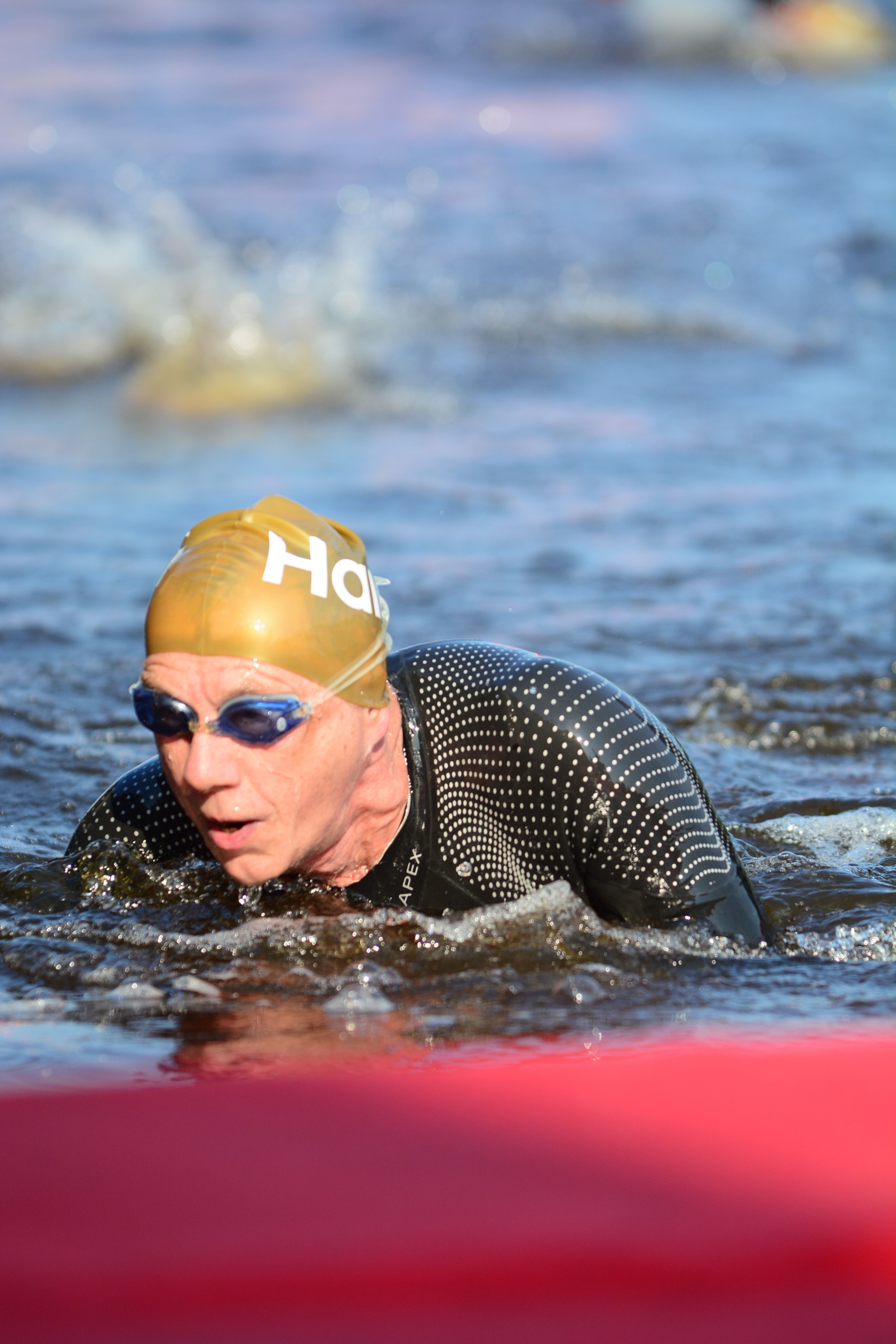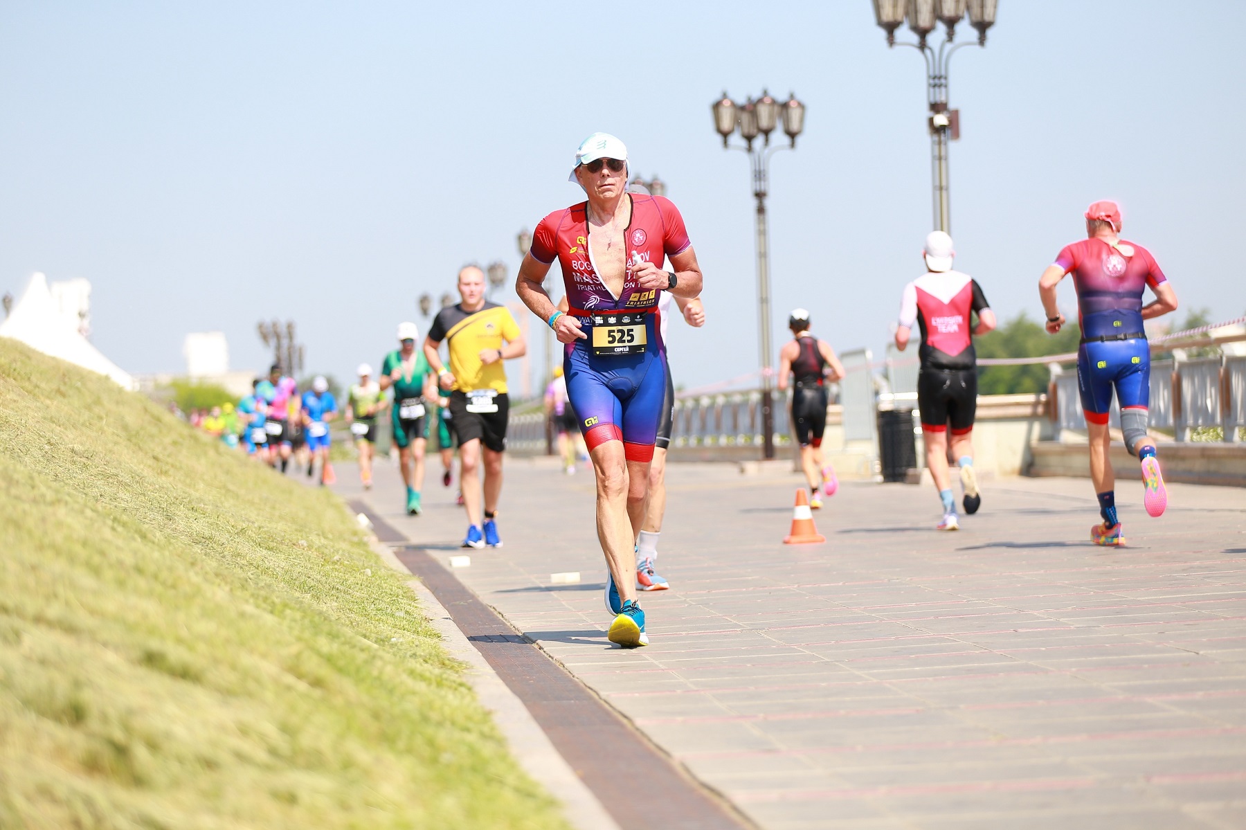 Поздравляем победителя и публикуем небольшой его отчет о стартах. «Плавание начал в группе сразу после элиты (категория на фестивалях спорта IRONSTAR 2024 – Ред.). Первый раз плыл комфортно, никого рядом не было, ориентировался на буи, но это было не оптимальным решением. Нужно было первые пять буев прижиматься к левому берегу, чтобы сократить расстояние. Это я понял после третьего буя и ориентировался на самый дальний, который был виден. Вел без каких-то проблем. Был небольшой ветер, – на юг ехал примерно 33 км/с, на север около 40. Средняя 34.7, пульс 136. Перепад 270 м. Трасса довольно плоская, асфальт на четыре балла из пяти. Когда приехал на финиш, казалось, что недоработал, можно было быстрее, но впереди был бег. Бег начал спокойно по 5. Особого дискомфорта не ощущал, было жарко, на солнце плюс 42 градуса, в тени – 36, но на пунктах питания была холодная вода, губки. Также волонтеры обливали по всей дистанции. Пульс постепенно вырос до 160. Я стараюсь не превышать этот показатель и не переходить в красную зону. Темп немного снизил, пульс упал до 155. Примерно с таким пульсом продолжал бег. После второго круга начались судороги в икрах, через небольшое время начало сводить заднюю поверхность бедра (не помню, когда у меня были судороги на беге последнее время)».