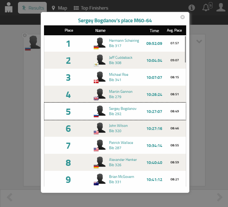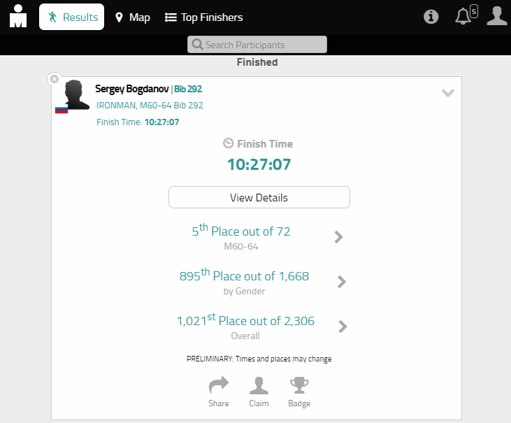 Из сообщения Сергея Федоровича: "KONA 2018, 5 место в группе, время 10:27:06. По сравнению с 2014 годом (тогда я был на 36 месте) улучшил время больше чем на час."