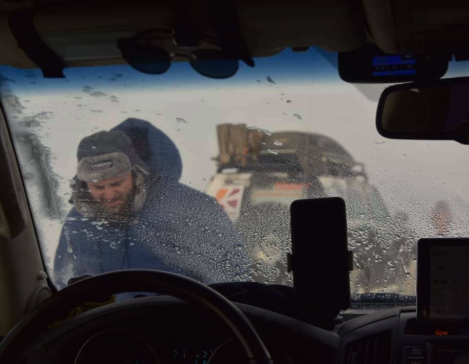 Почти все дни задувала сильная метель с мокрым снегом. Температура днём поднималась до +6 градусов, ночами максимум -8. Снега намело от полутора метра. Снежного наста на зимниках нет, как и самих зимников. Машины всё время валятся. Пришлось много копать и лебедить друг друга.