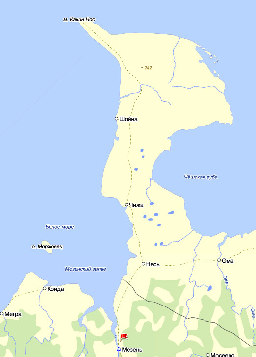 -Шойна-Канин нос(маяк)-Шойна-Чижа-Несь-Мезень.