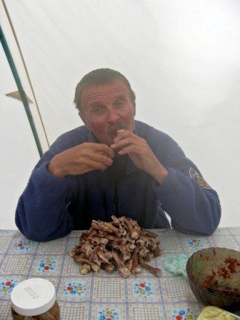 О: Очень удобно. А в сочетании с пуховками – у меня Эрцог, а у Виталия какая-то другая – вполне достаточно. Можно сказать, оптимально. Внизу, в базовом лагере – там спальники, конечно. У меня Памир – за глаза хватает. Его же я таскал на акклиматизации. И палатку, кстати, на Хан Тенгри я тоже брал старую – и поломало ее.