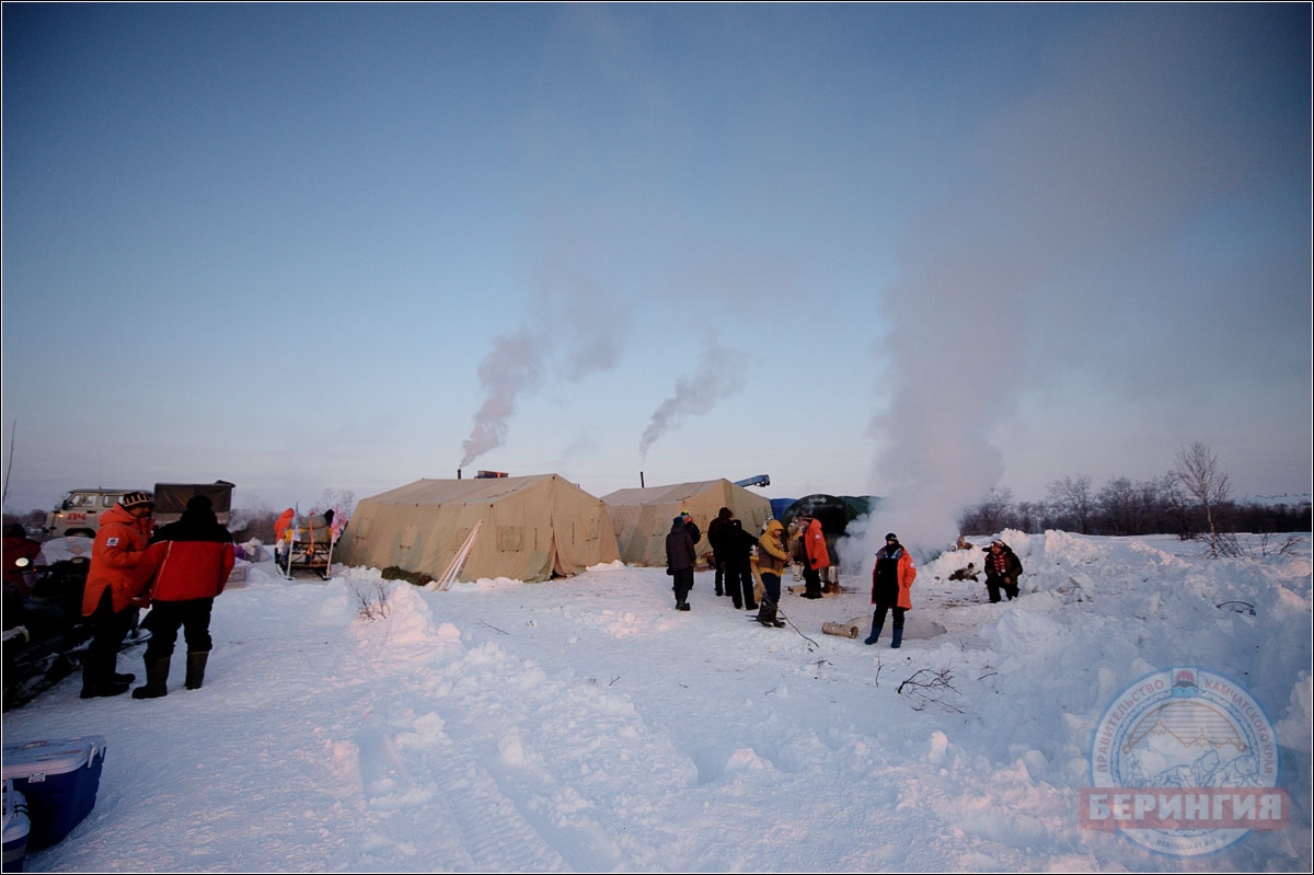 Позади 740 км. Каюры с собаками расположились на день отдыха в Оссоре, пройдя самый короткий этап гонки в 18 км.