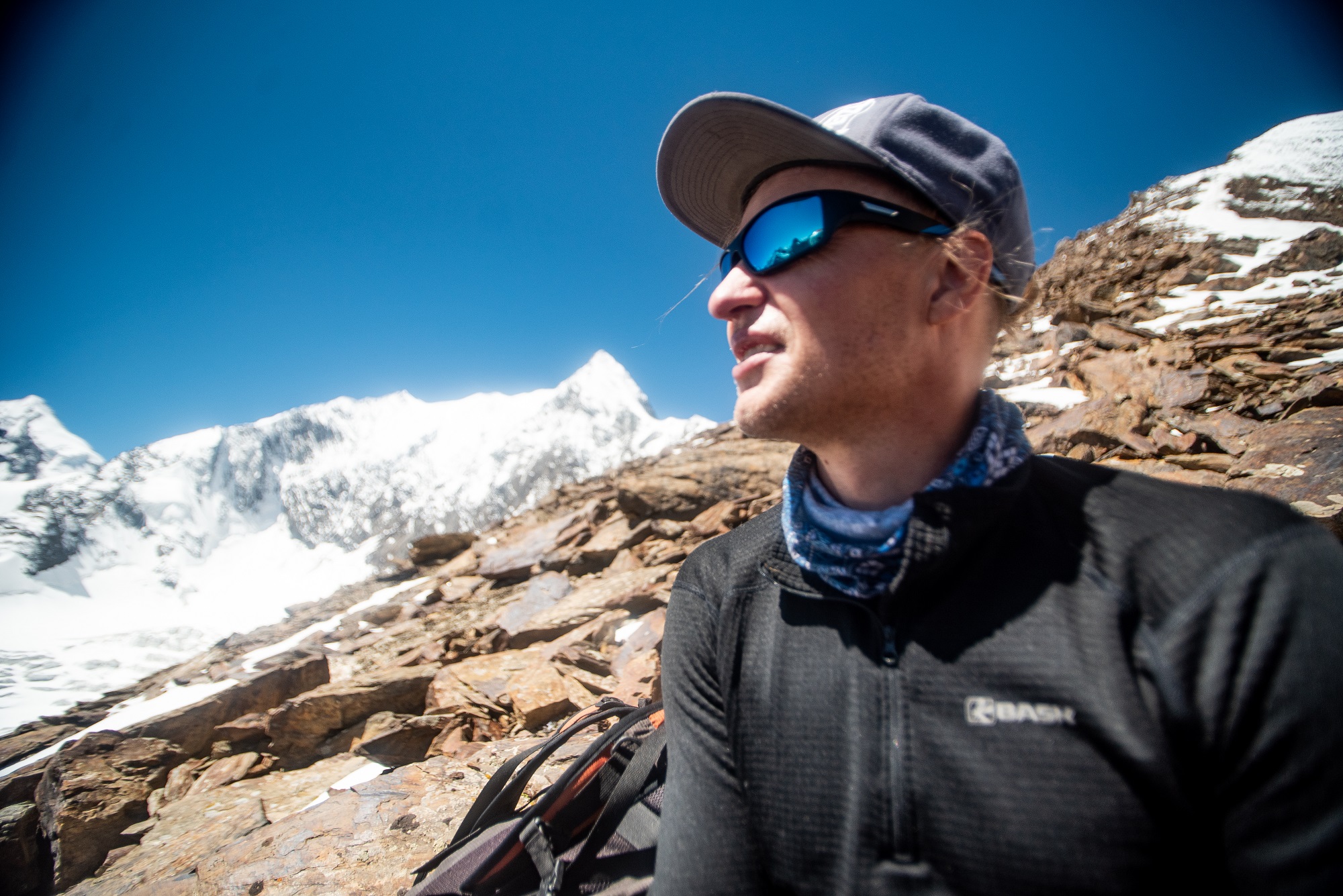 Сюрпризом оказался спуск. По пути подъёма и по кулуарам вдоль горы спускаться было максимально небезопасно. По линии подъёма пришлось бы бить шлямбура (брали их про запас, на всякий случай, – не пригодились), оставлять все якоря, френды. Но куда больше вызывали опасение камни. С крыши вообще пришлось бы лазанием спускаться. По стене тоже были сомнения: многотонные камни так и ждут, пока их скинешь на себя веревкой. По кулуарам бьют камни. Вышли на вершину, собрали тур, и с вершины увидели многообещающую перемычку. Подошли к ней (буквально 100 метров пешком) и просмотрели практически весь спуск до низа. Правда, это была долина, в которой мы не были никогда. Но решили, что попытка спуститься ногами куда заманчивее, чем дюльфера с возможностью скидывания на себя множества камней. Повезло (а нам вообще везло на этом восхождении), – спустились полностью ногами вдоль ручья, который начался в середине спуска. Ручей прорезает скалу насквозь, и вдоль него мы вышли почти к самому леднику долины Джаупая (Джобая), минуя все сбросы».