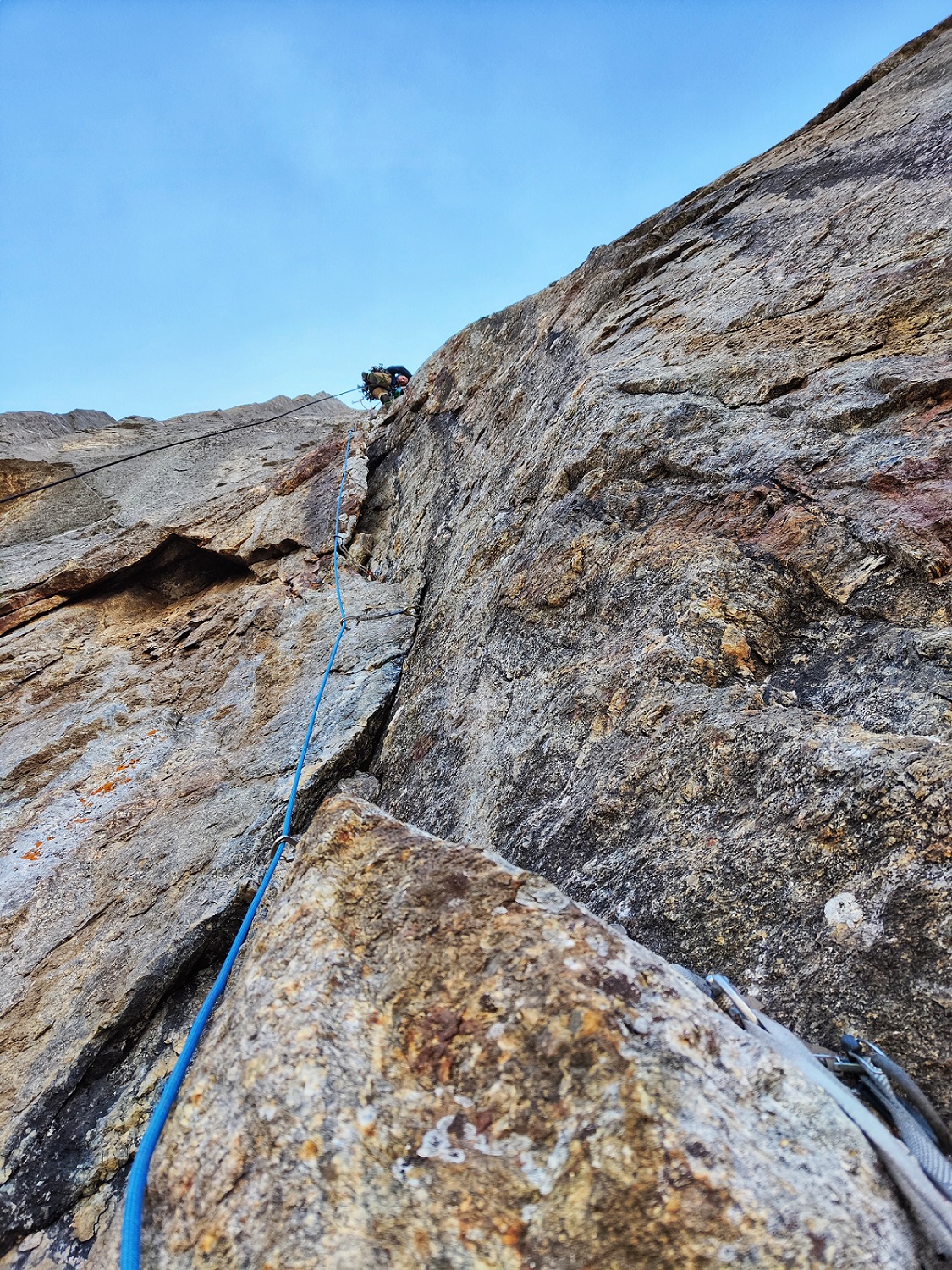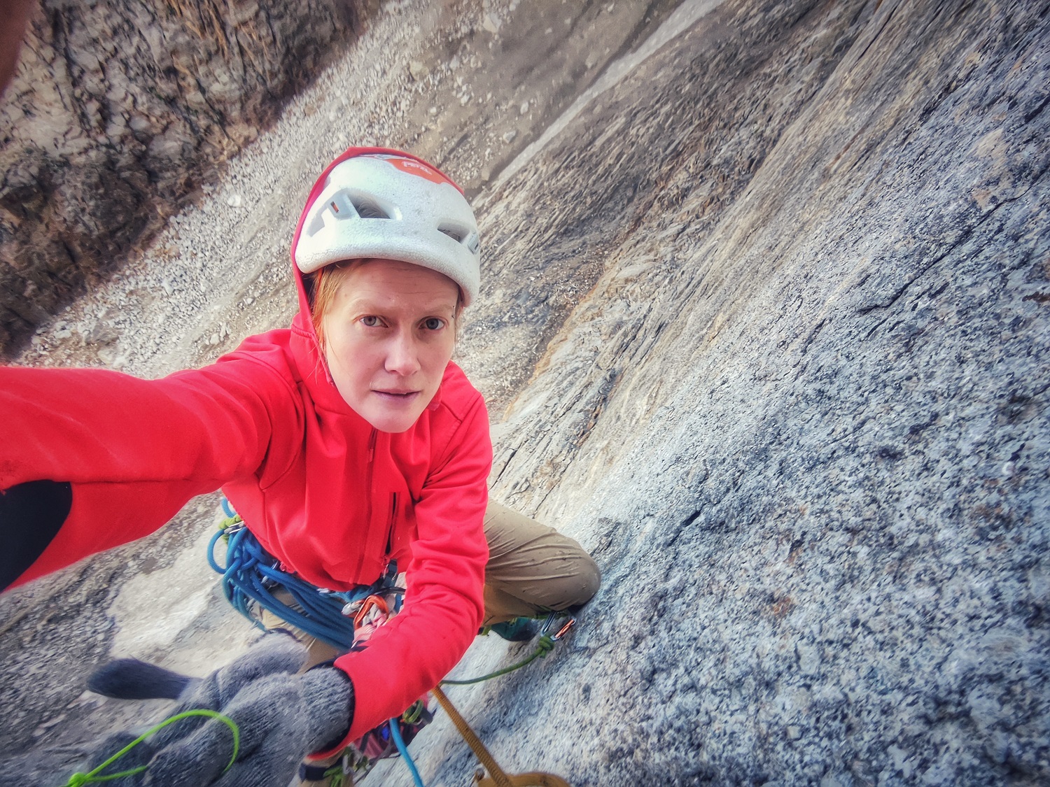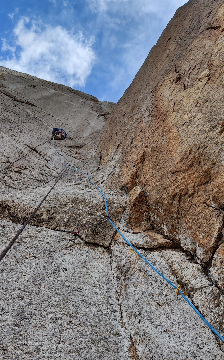 «Лезли два дня, много сложного рельефа. Линия – самая логичная на стену, высота 4430м по GPS. Долго думали, брать ли платформу. Нас всего двое, и грузоподъёмность одного (точнее, одной из нас) – не самая высокая. На стене не было воды. С платформой лезть намного надежнее и проще тактически. Ночевать можно где угодно. Выше половины стены просматривалась перспективная полка. Но, если брать платформу, то у второго вес баула превысит 20 кг, – с таким грузом мы до полки почти гарантированно не долезали. Думали-думали и решили рискнуть: берём палатку, лезем до полки. Вроде чуть ниже основной полки виднелись микро-полочки. Думали там пересидеть, если что пойдет не так. В итоге к полке вылезли полвосьмого вечера, а в 20:40 уже сделали комфортную полку под двух человек, на которой и заночевали. Затем лезли ещё весь день – с шести утра до 15 часов.