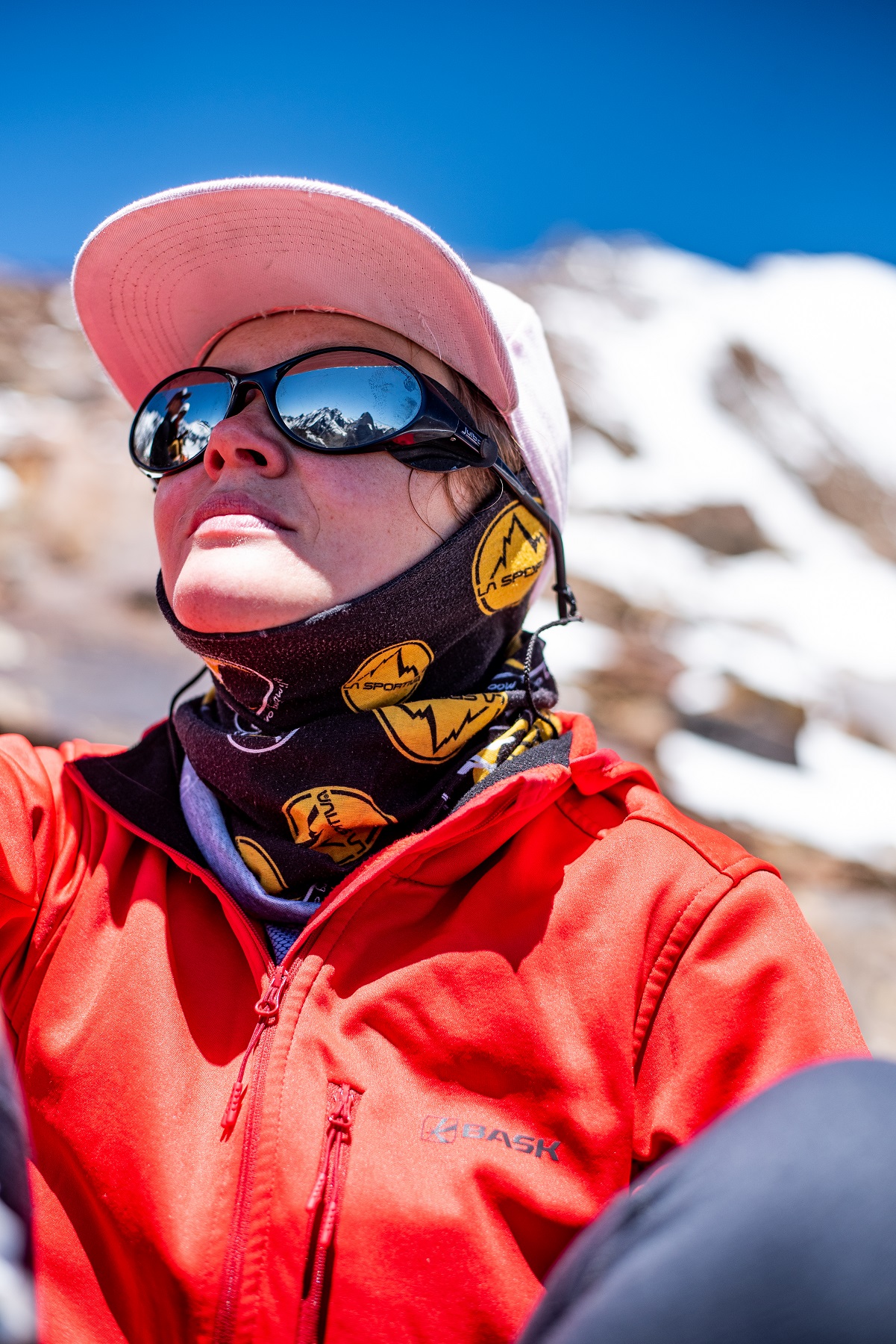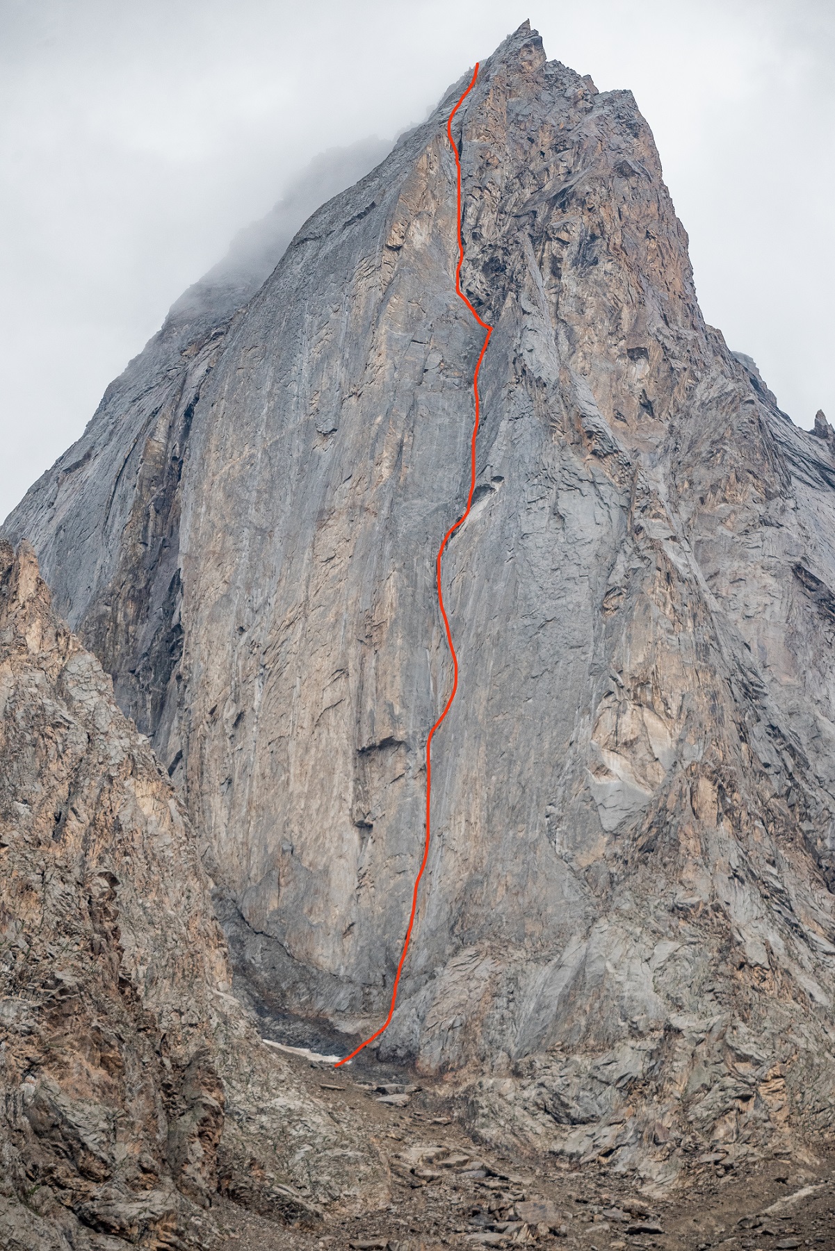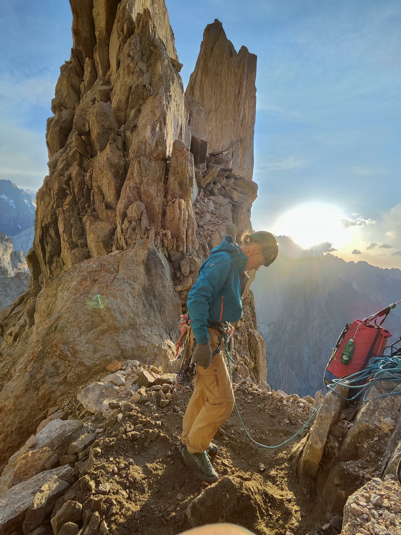 «Лезли два дня, много сложного рельефа. Линия – самая логичная на стену, высота 4430м по GPS. Долго думали, брать ли платформу. Нас всего двое, и грузоподъёмность одного (точнее, одной из нас) – не самая высокая. На стене не было воды. С платформой лезть намного надежнее и проще тактически. Ночевать можно где угодно. Выше половины стены просматривалась перспективная полка. Но, если брать платформу, то у второго вес баула превысит 20 кг, – с таким грузом мы до полки почти гарантированно не долезали. Думали-думали и решили рискнуть: берём палатку, лезем до полки. Вроде чуть ниже основной полки виднелись микро-полочки. Думали там пересидеть, если что пойдет не так. В итоге к полке вылезли полвосьмого вечера, а в 20:40 уже сделали комфортную полку под двух человек, на которой и заночевали. Затем лезли ещё весь день – с шести утра до 15 часов.