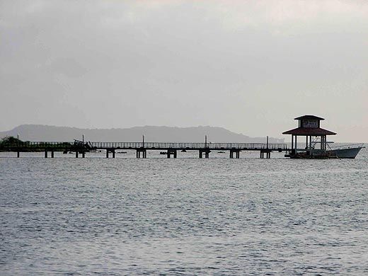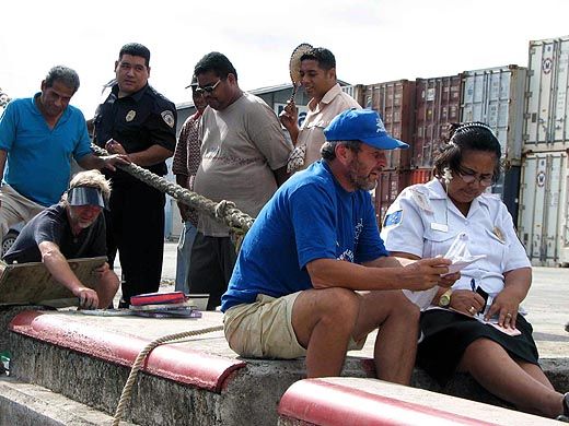 На подходе к острову Моэн - главному в лагуне - ливень прекратился. Открылся рейд, два судна на якорях и причальные сооружения. Яхт видно не было и как потом выяснилось, мы были единственные. Не очень-то популярно это место у яхтсменов. В полдень "Апостол Андрей" подошёл к причалу и у нас приняли швартовы. На палубу поднялись представители властей в количестве шести человек: порнадзор, карантин, иммиграционные офицеры и таможня. Пока мы заполняли бумаги с чиновниками иммиграции, остальные разбрелись по яхте в поисках недозволенных грузов, крыс и прочей напасти. Ничего найдено не было. Самым удачливым оказался представитель порта, который, наткнувшись на хранилище верёвок, отмотал себе, под присмотром боцмана, внушительный конец. Потом каждый департамент взял по 25 долларов, и карантинный офицер разрешил спустить жёлтый флаг. Иммиграция с таможней, прихватив наши паспорта и документы на яхту, сошла на берег, предложив подождать до 15 часов. В 17 часов никто нам документы не вернул. Позвонив в офис, мы получили устное добро на выход в посёлок, а окончательное оформление отложили на завтра.
