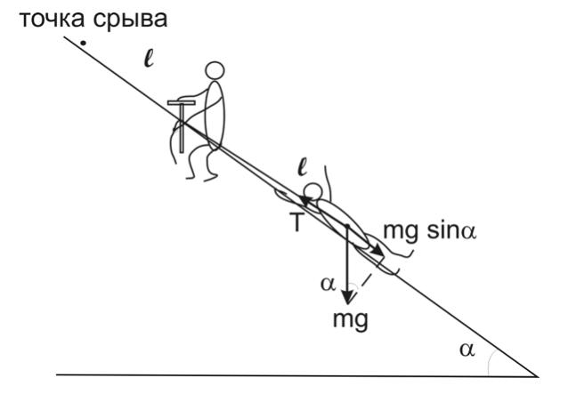 Рассмотрим срыв участника на снежно-фирновом склоне крутизной a к горизонту. Трением участника о склон и трением верёвки в карабине или о ледоруб пренебрежём. Считаем также, что участник не делает попыток самозадержания, а страхующий не успевает выбрать верёвку при срыве ведущего. Эта модель даст наиболее жёсткие требования к протравливанию верёвки. Учёт трения и выбирания верёвки только улучшает страховку.