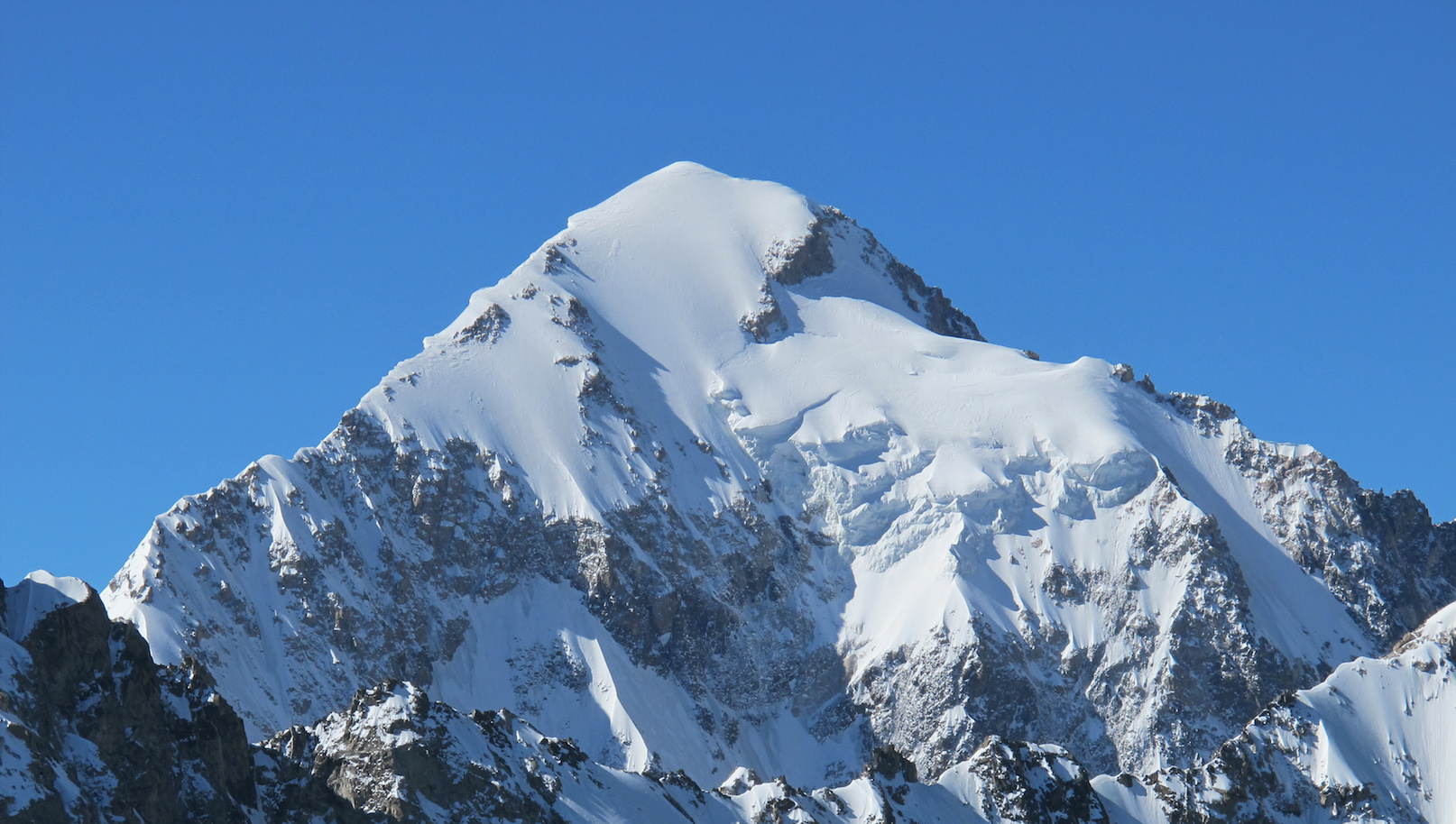 Предыстория. Давайте взглянем на фото вершины Коштан-тау. Слева на нём хорошо просматривается предвершинная часть северного гребня (4Б, маршрут Вуллея, 1889г.), справа – верхняя часть маршрута Калишевского 5Б, 1957г. Оба маршрута достаточно популярны. С одним из участников команды, ходившей по Калишевскому в прошлом сезоне, я разговаривал лично. На вопрос о страховке на снегу, он ответил, что иногда на две верёвки удавалось закрутить только один(!) бур. На маршруте 4Б дела со страховкой обстоят ещё хуже...