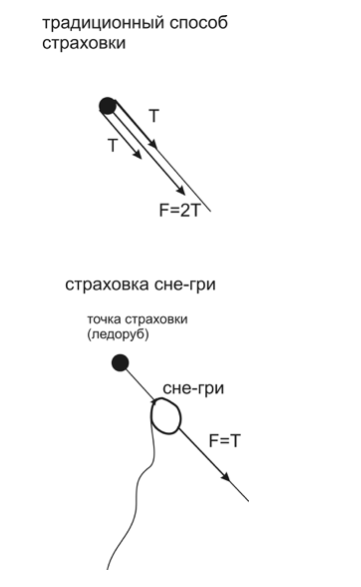 Эта формула не рассматривает нагрузку на станцию и поэтому одинаково применима как к традиционному способу страховки через ледоруб, так и к страховке с помощью сне-гри. Введём силу F, действующую на станцию. Ясно, что эта сила имеет принципиальное значение, которое лучше всего выражает крылатая фраза: «Ледоруб держит 100кГ». Понятно, что максимальное усилие, которое в состоянии выдержать ледоруб, сильно зависит от нескольких факторов: от плотности снега, глубины, на которую забит ледоруб (или от его длины), усилия, с которым навалился на головку ледоруба страхующий и т.п. Но порядок величины всё равно останется тем же 100-200 кГ. Именно в этом принципиальное отличие страховки на снегу от страховки на скалах или на льду, где точки страховки могут быть сделаны достаточно надёжными, так что надёжность точки страховки перестаёт ограничивать надёжность всей страховочной цепи. Итак, рассмотрим силу F, действующую на станцию. В случае сне-гри F=T, тогда как при обычном способе страховки через ледоруб F=2T (см.рис.).