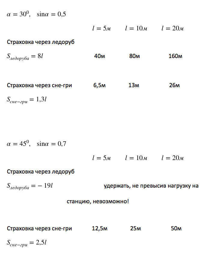 Зафиксируем максимальное усилие, действующее на станцию F=100кГ и рассчитаем тормозной путь S, необходимый для задержания сорвавшегося участника массой 80 кг для склонов крутизной 30 и 45 градусов (наиболее актуальный для страховки на снегу диапазон уклонов) при двух способах страховки. Для сне-гри справедлива формула:
