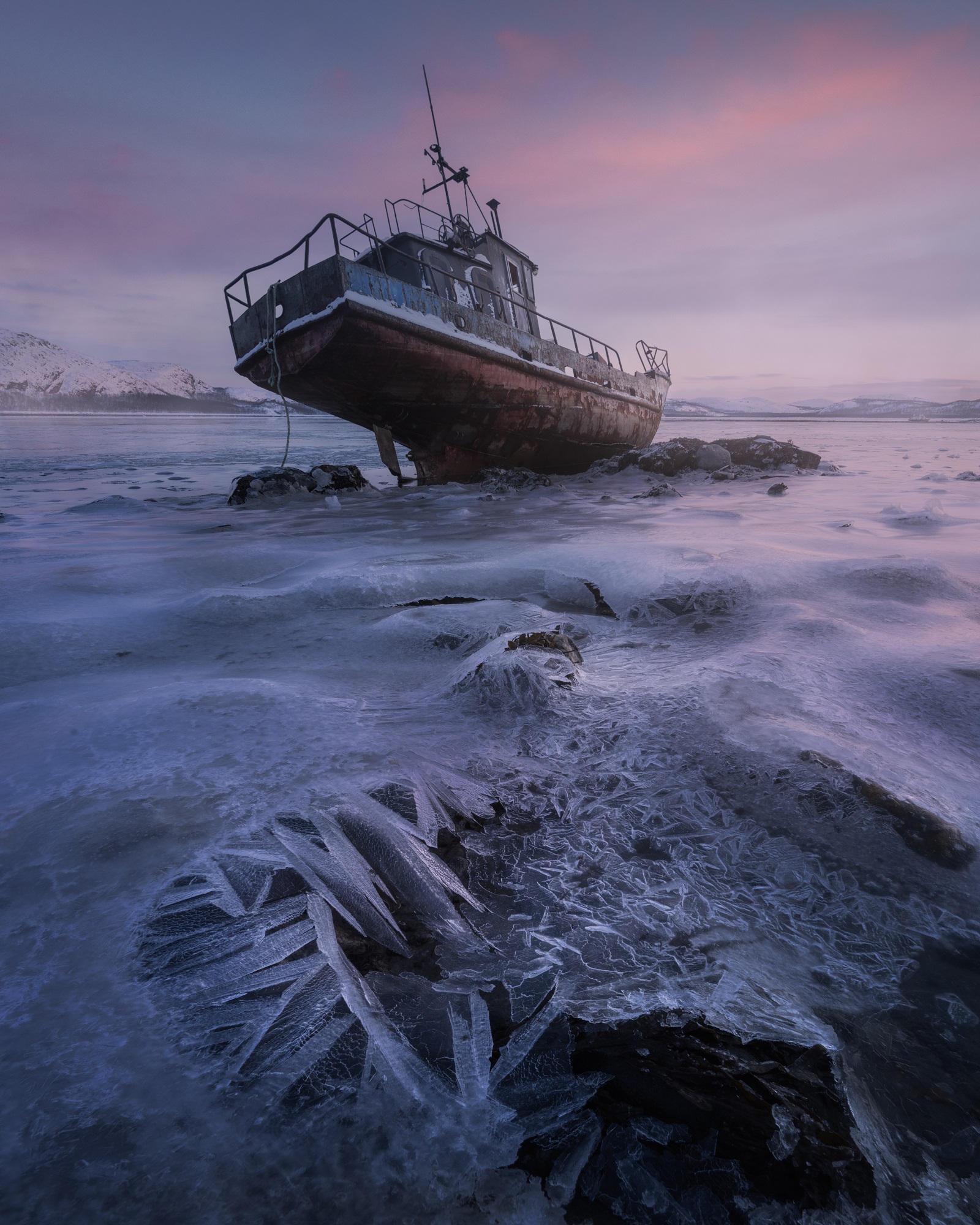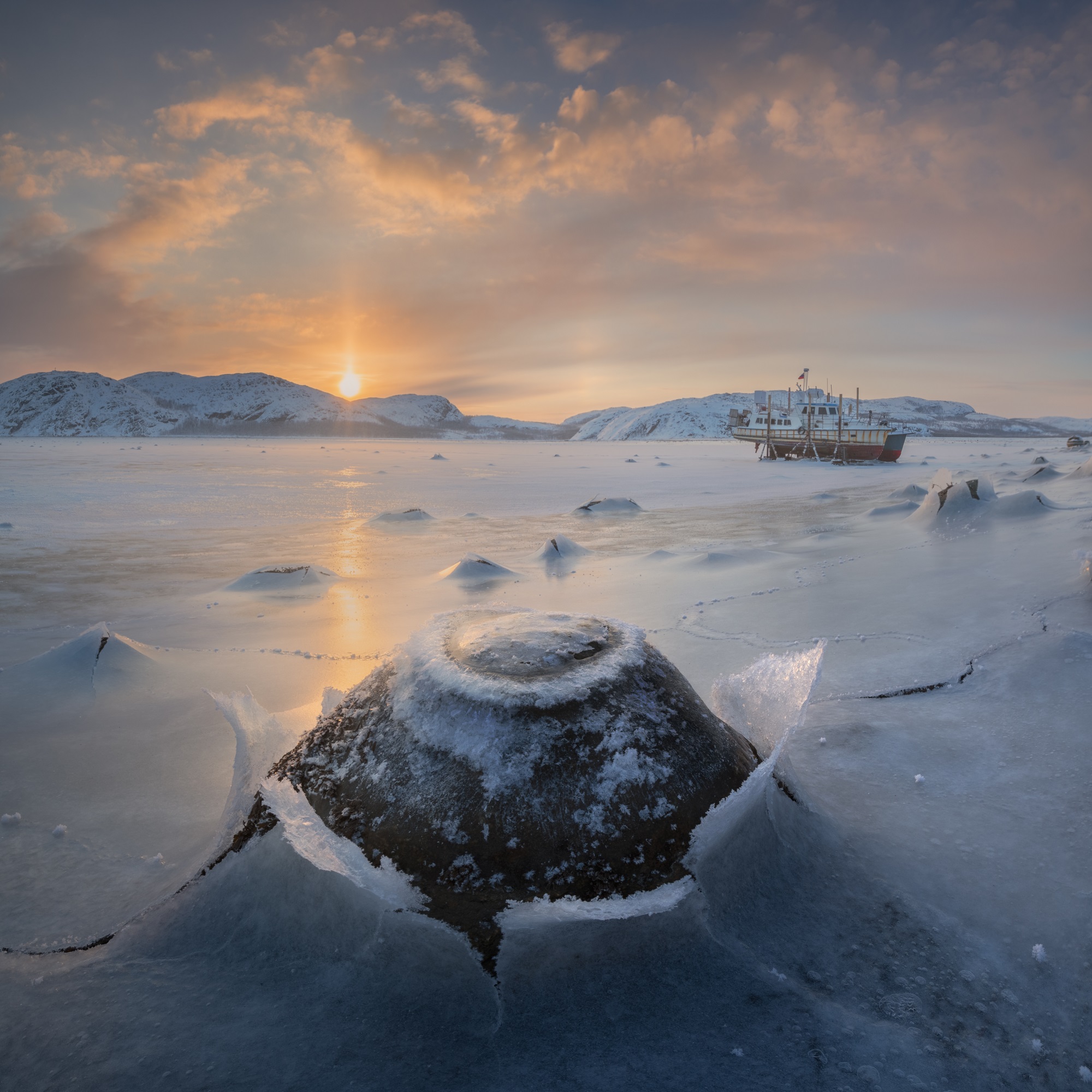 «Конец июля и август - моё любимое время в Гренландии. Солнце в эти дни просто катится по горизонту всю ночь. Если повезёт с погодой, то можно наблюдать закат длиной в 5-6 часов. Так было и в эту ночь» – про «Алые ночи Гренландии» (2015).