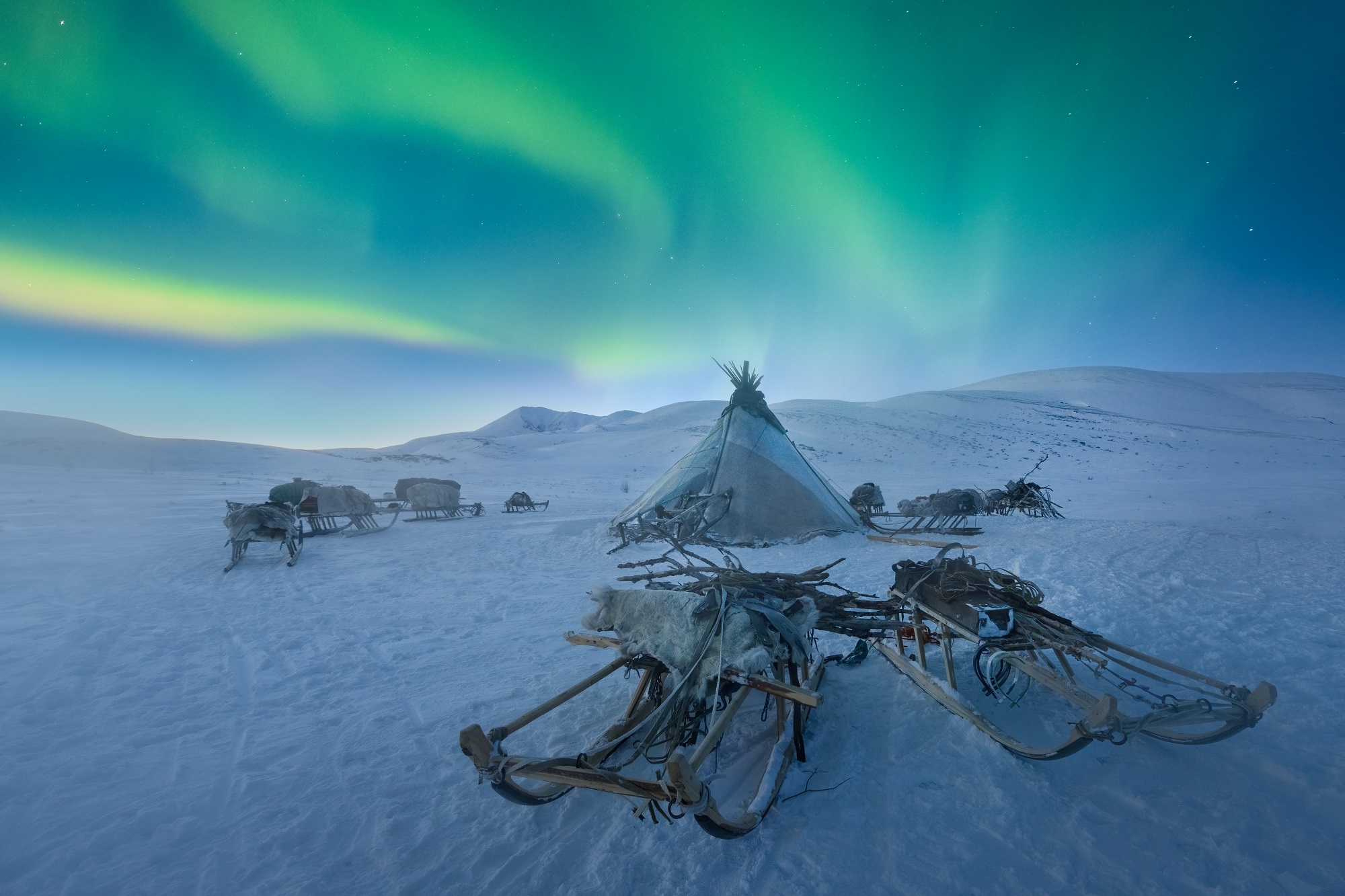 «Северное сияние над чумом, где я прожил неделю в гостях у ненцев. Фотографировал их быт, костюмы и главное, – аргиш, – миграцию ненцев на север. Именно в последнюю ночь аргиша удалось снять сияние в холодную погоду при -35С», – о работе «В гостях у ненцев» (2021).