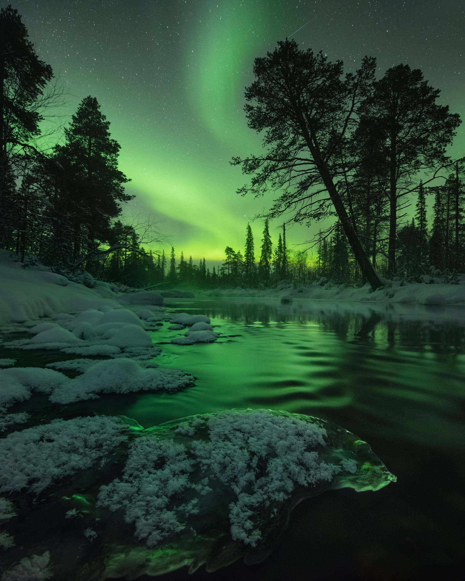 «Северное сияние над небольшим ручьём недалеко от Мурманска. Удивительно, что речки здесь порой не замерзают даже при -35С. В ожидании сияния, приходилось стоять по колено и выше в воде» – о фотографии «Реки Заполярья» (2020).
