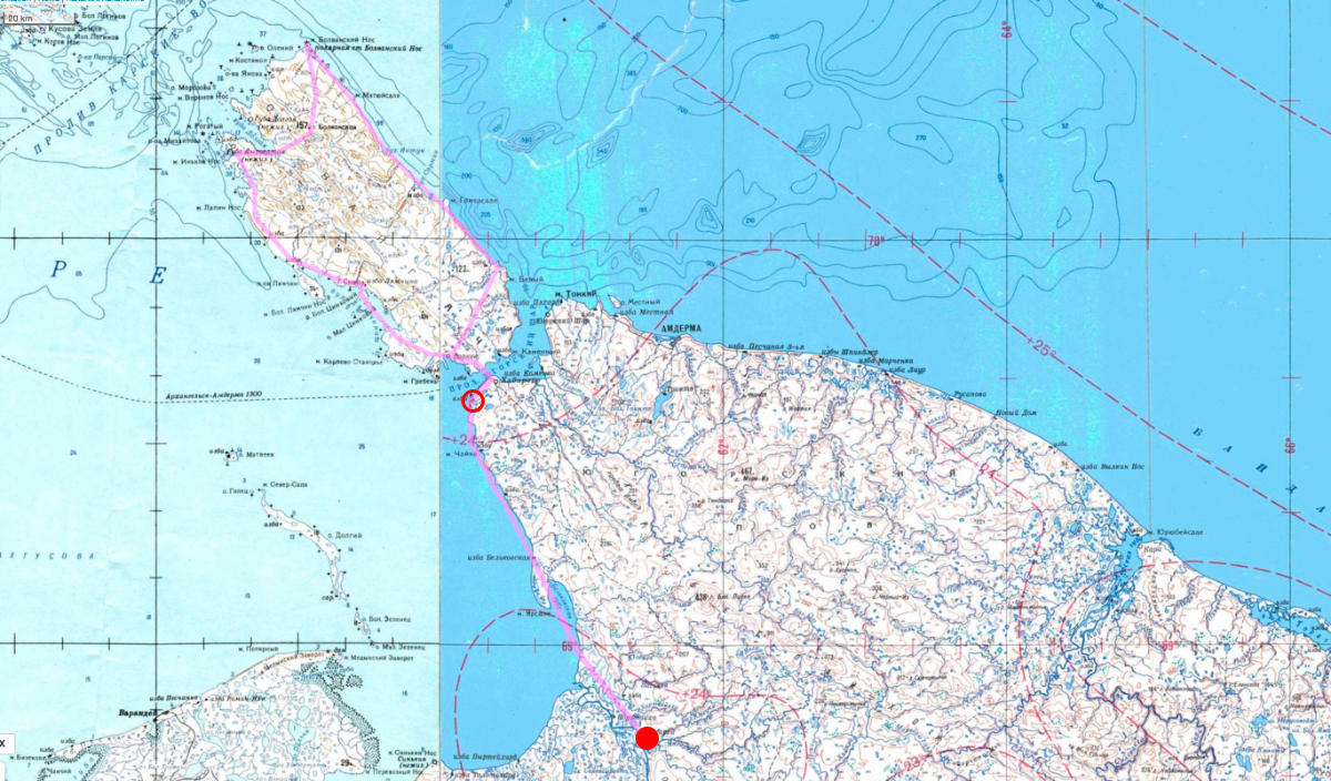 Следующий пункт Белый Нос, в 100 км от старта. По пути нет ни одного укрытия. Ребятам предстоит одна ночевка в палатке, в лучшем случае, а если ударит непогода, дикая жизнь может заметно растянуться во времени. У них немыслимое количеством багажа — около 80-90 кг на человека, приличного объёма. Будет несладко.