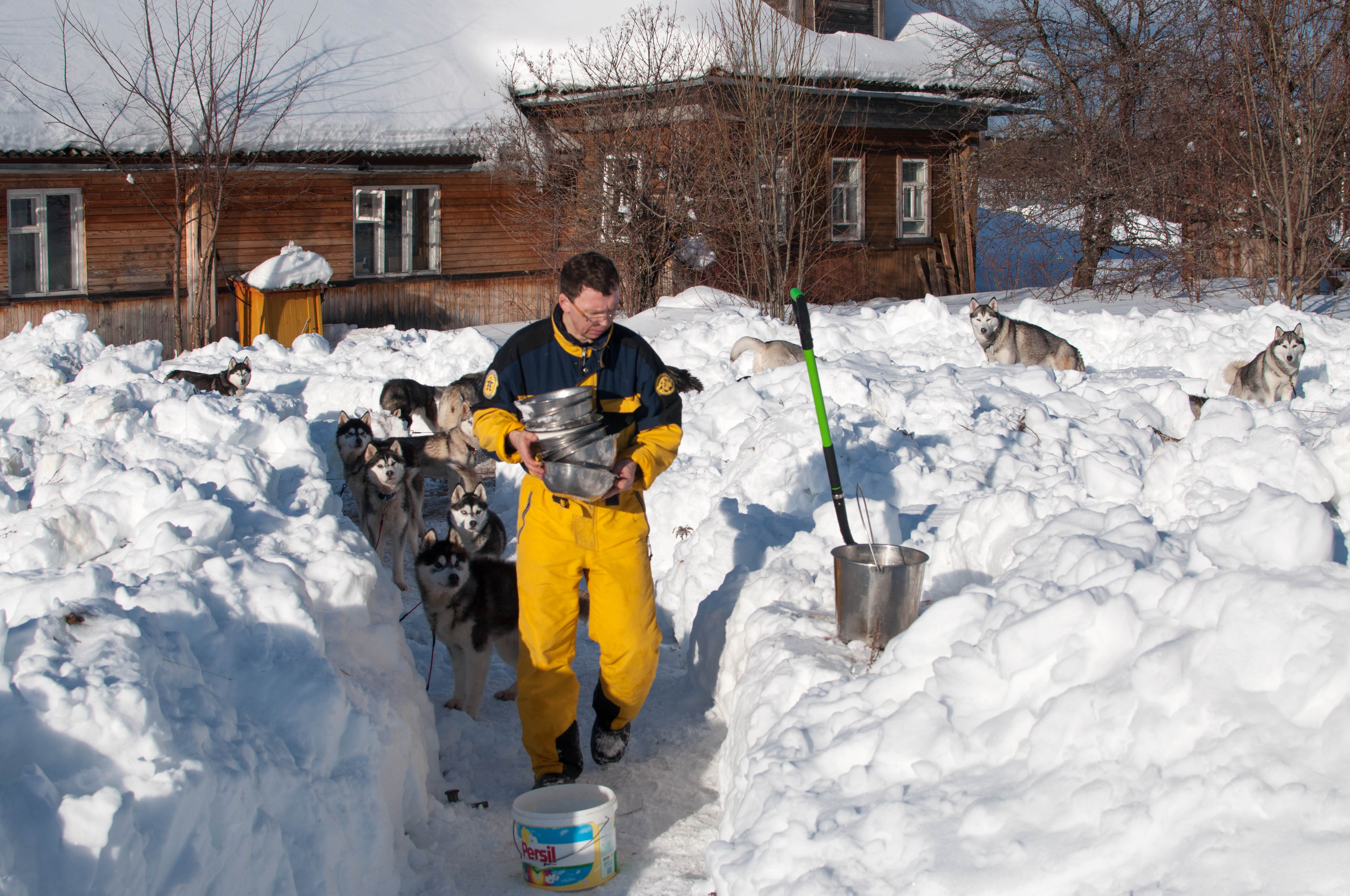 Отдельное приключение — это доставка собак к старту. Большинство из участников живут далеко от мест проведения гонок. Если двух-трёх собак можно привезти на легковой машине, то упряжку побольше приходится помещать в специально оборудованные микроавтобусы или даже в прицепы. Каюр одновременно конструктор и мастер на все руки. Многие детали упряжи, саней и всего необходимого он делает сам!
