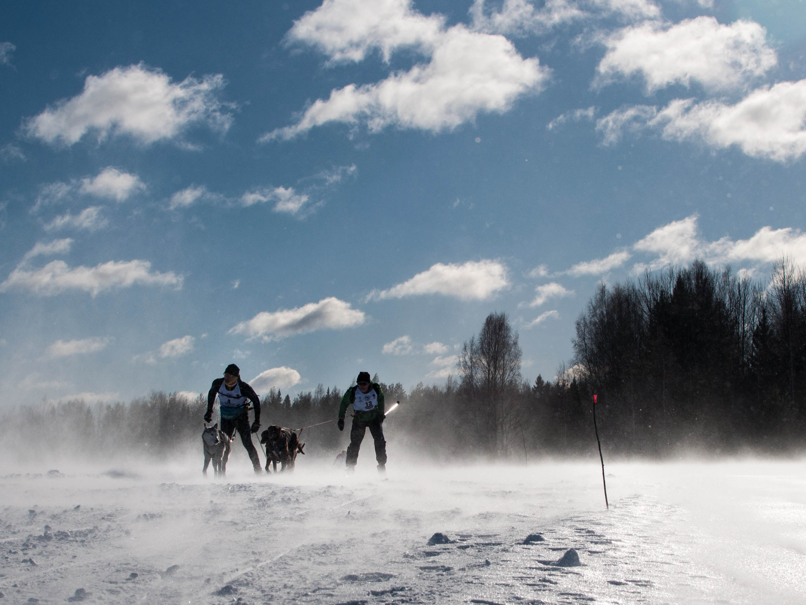 Свой вклад вносит погода, она добавляет элемент неожиданности в каждый день. То плюсовая температура и собакам жарко бежать**, то ураганный ветер и приходится трудно всем. Подморозило — снег стал колючим и ранит собакам лапы, нанесло снега — нарты и лыжи вязнут в мягком снеге. Не соскучишься!