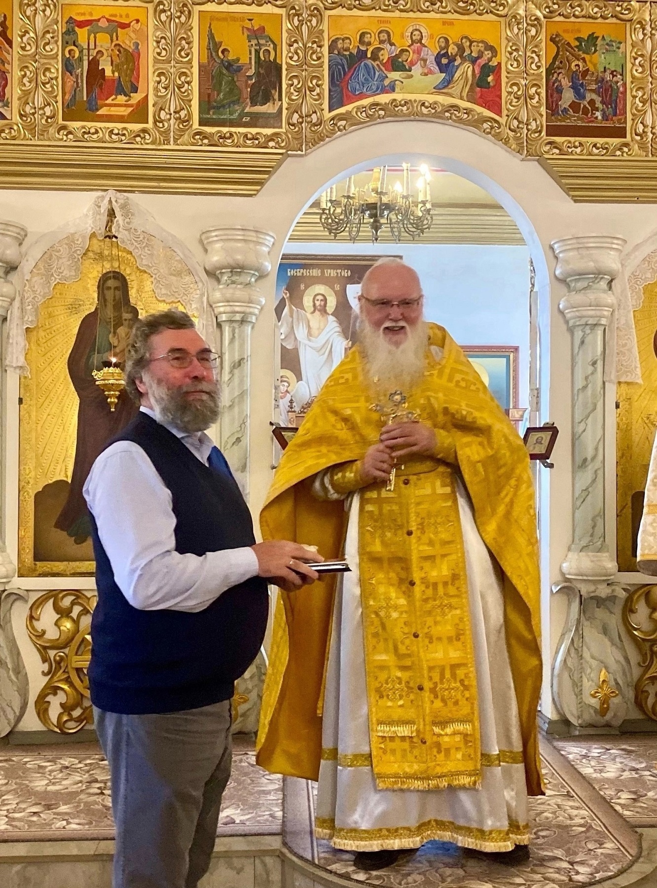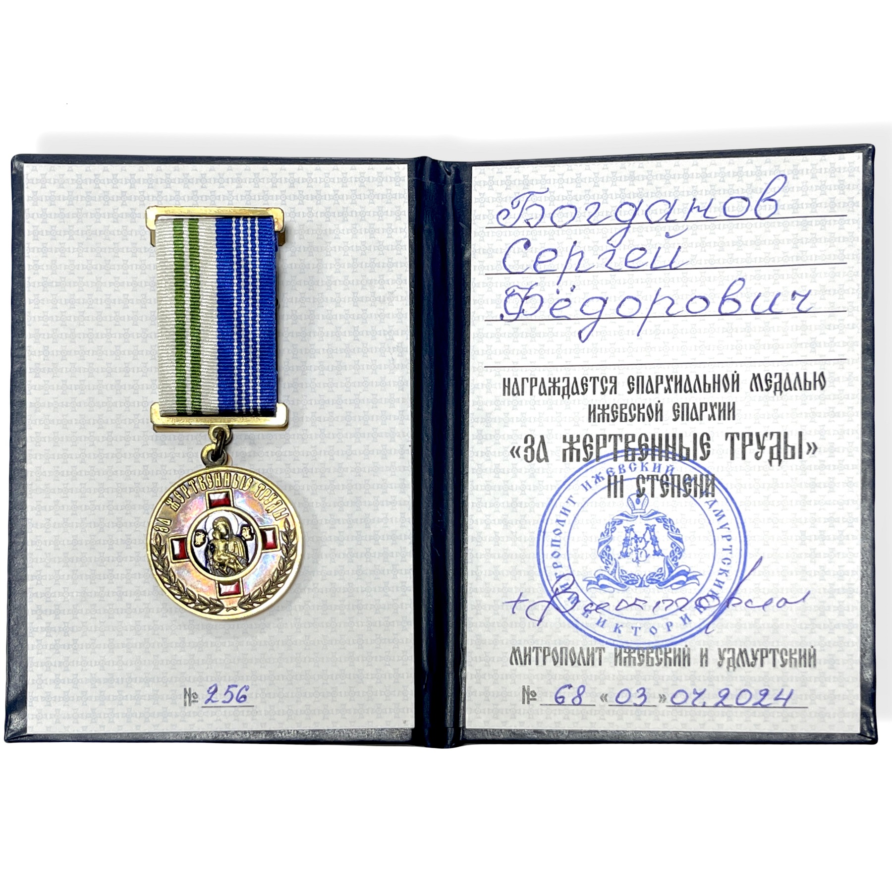 На прошлой неделе меценатские труды Богдановых отмечены были епархиальной медалью Ижевской епархии «За жертвенные труды» III степени. Высокую духовную награду, по поручению Митрополита Ижевского и Удмурдского, Владимиру Богданову передал отец Александр, настоятель Храма Святителя и чудотворца Николая в с.Вавож. «Поддержка и память о родных – важные моменты для каждого из нас», –написал официальный канал «Вавожский район с.Вавож», освещая визит Богдановых и сообщая о высокой оценке их созидательной деятельности на малой Родине.