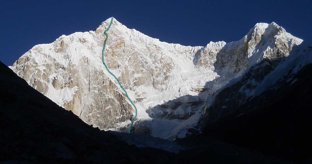 Двойка сообщила, что сегодня преодолела ледопад и ночует на косой полке под стеной. Насколько известно, предполагаемый маршрут - на фото выше, и команда планирует его придерживаться.