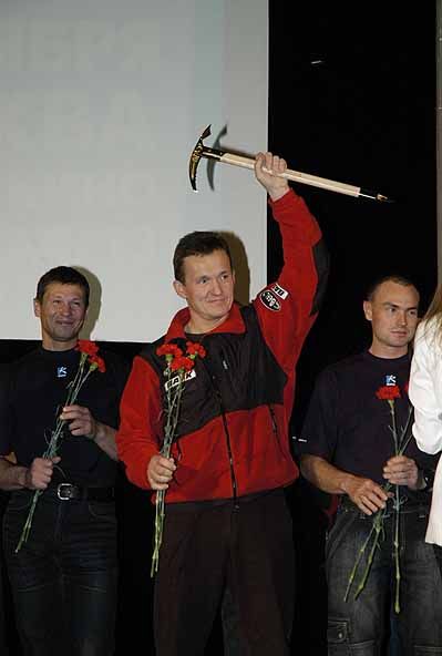 получившие драгоценный приз, под знаменитую песню Юрий Визбора свыше тысячи зрителей стоя аплодировали героям. Под лучами софитов золотом сверкали одновременно четыре русских «Золотых Ледоруба»! Сильнейшие спортсмены современности, люди–легенды, своими беспрецедентными восхождениями принесшие России славу ведущей альпинистской державы, впервые собрались на одной сцене. Организатор фестиваля: компания БАСК, ведущий российский производитель одежды и снаряжения для спорта и отдыха. Спонсор фестиваля: Промышленный союз «Новое содружество» Партнеры Фестиваля: сеть магазинов «Активный отдых», «Альпиндустрия», спортивный клуб «Кант», La Sportiva Информационные спонсоры Фестиваля: "Спорт-экспресс", журналы "ЭКС", "РИСК Онсайт", "Туристический олимп", "Фактор риска", газета "Вольный ветер", «Экстрим» Информационная поддержка: журнал "Мир путешествий", www.mountain.ru, www.vvv.ru, www.risk.ru, www.russianclimb.com. www.aplclub.ur.ru, www.fany.ru, www.ex-magazine.ru