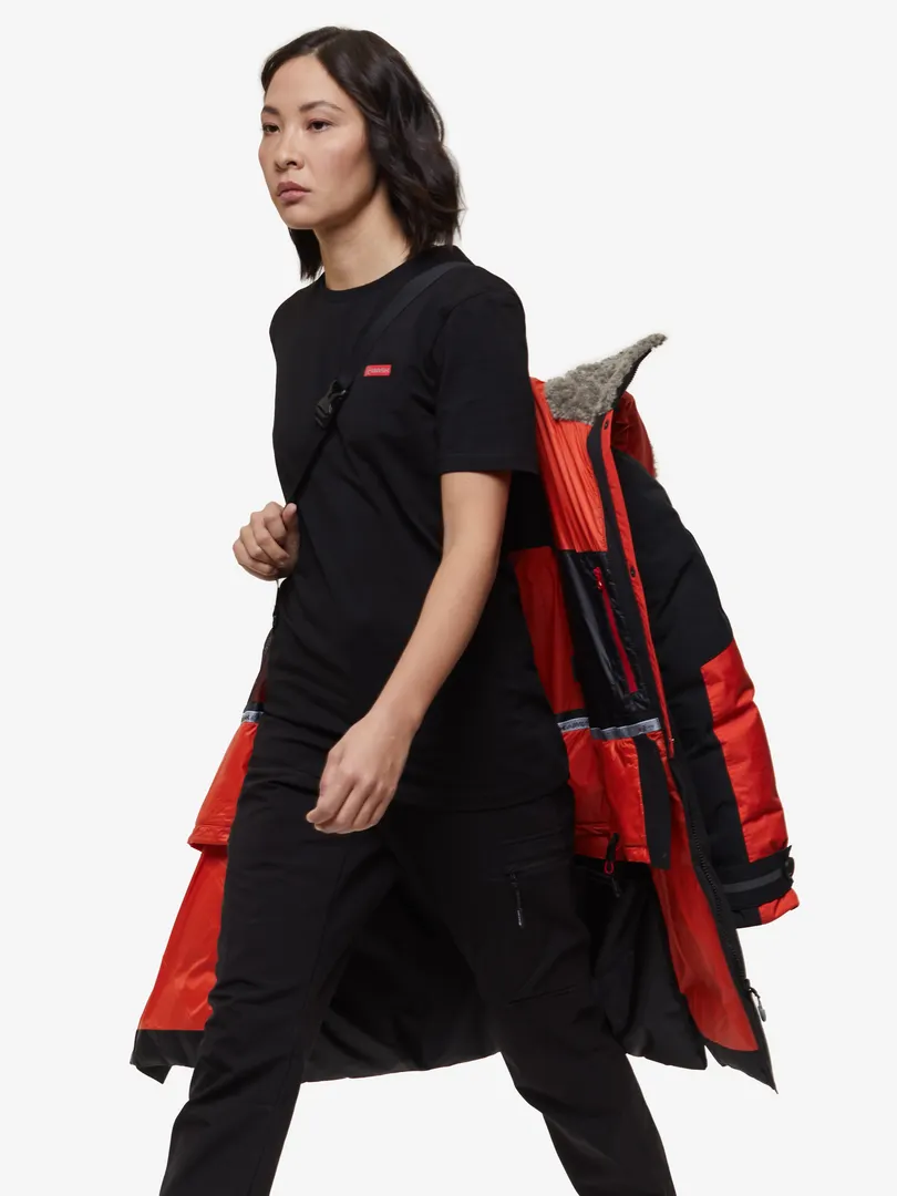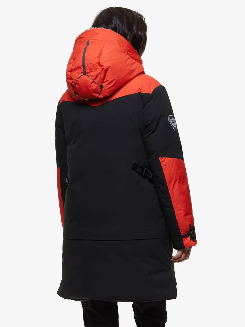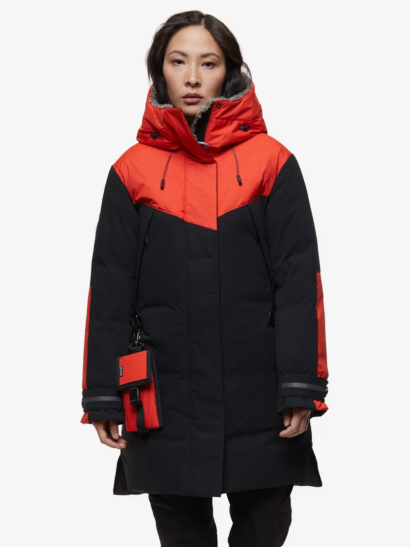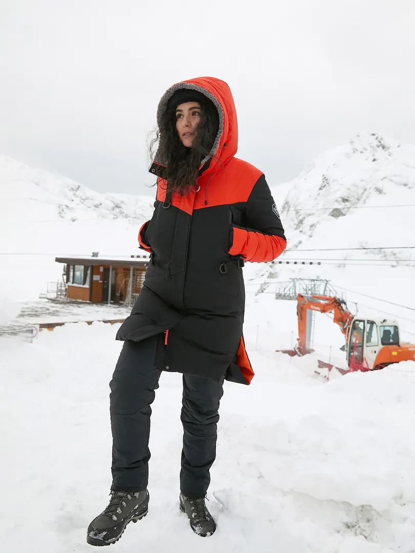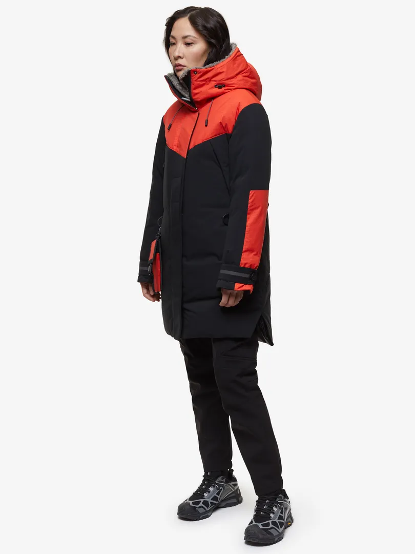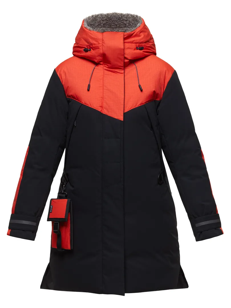 Элегантная женская удлиненная куртка с оригинальным дизайном на пуховом утеплителе для активного отдыха и города, для долгих путешествий и зимних outdoor-приключений