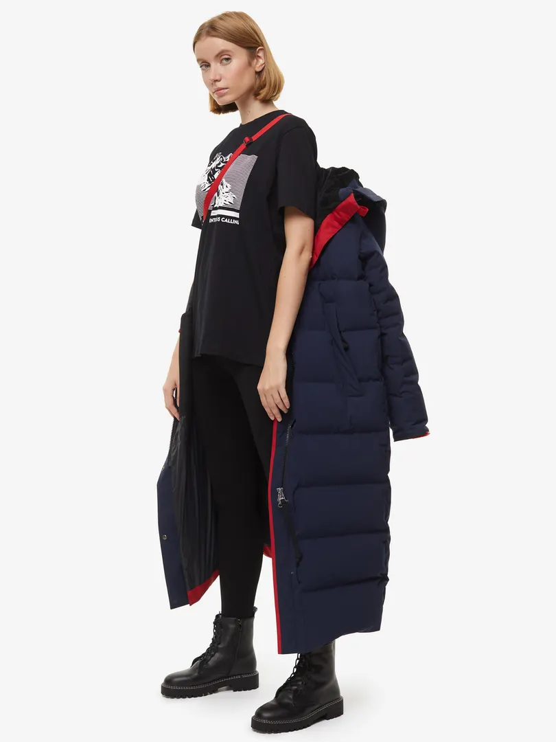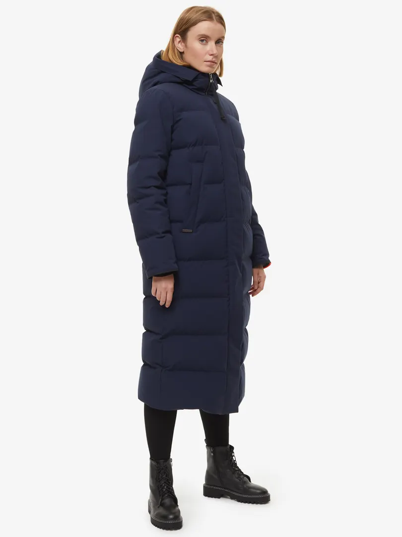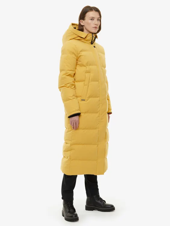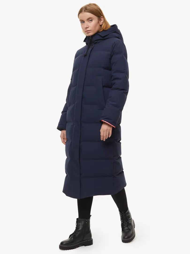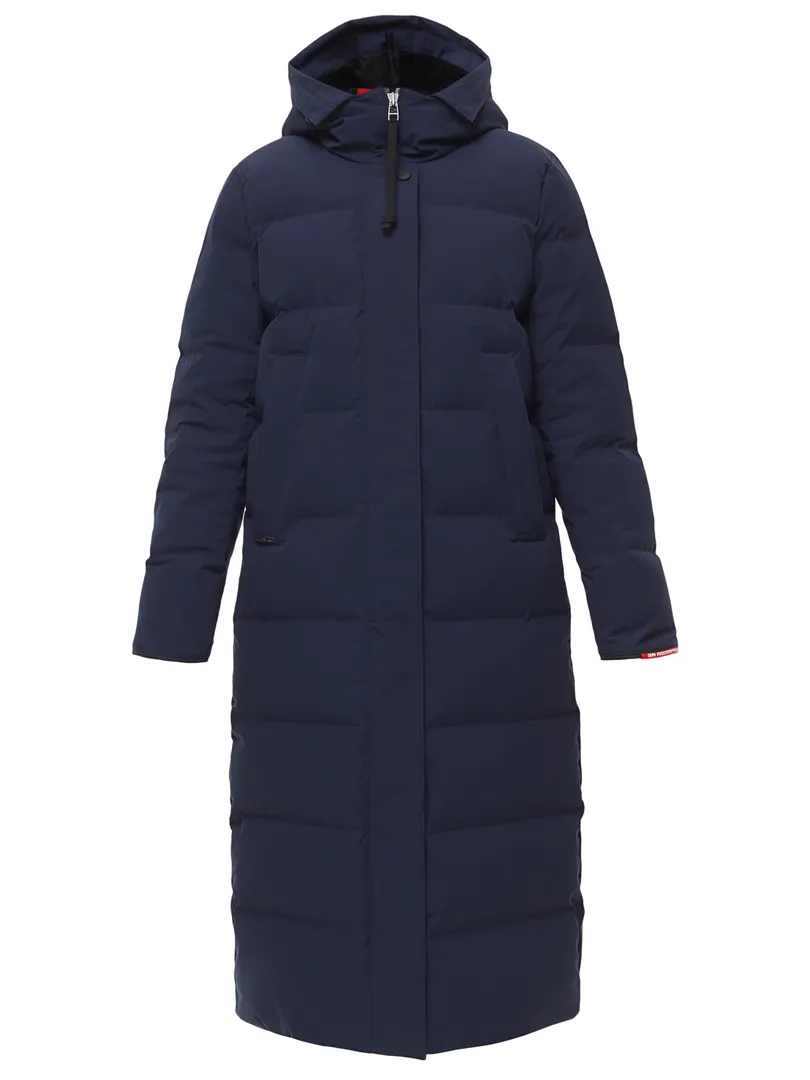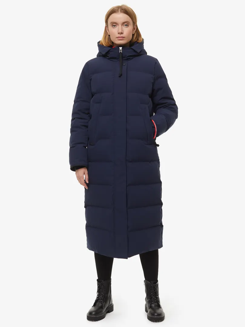 Женское длинное пуховое пальто прямого кроя, предназначено для холодных городских зим
