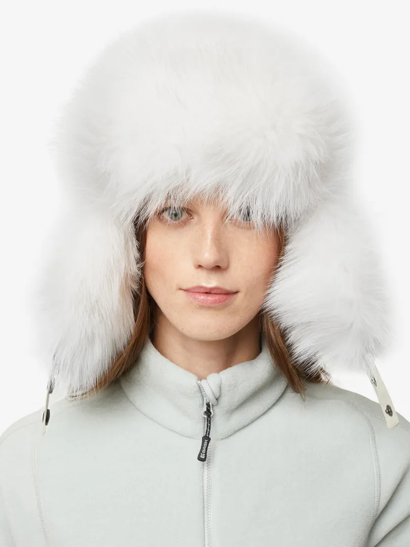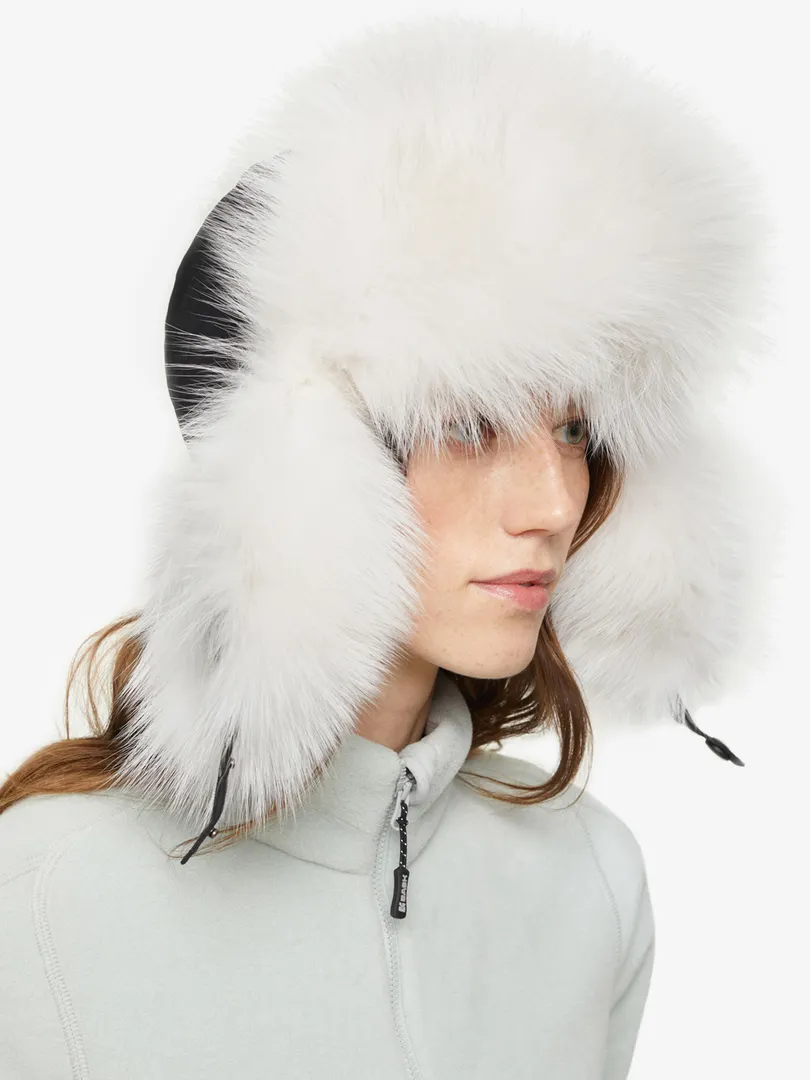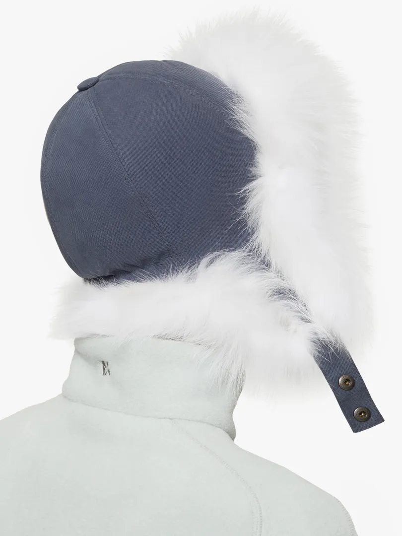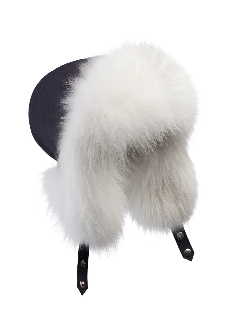 Теплая женская шапка-ушанка из мембранного материала с отделкой натуральным мехом полярной лисы