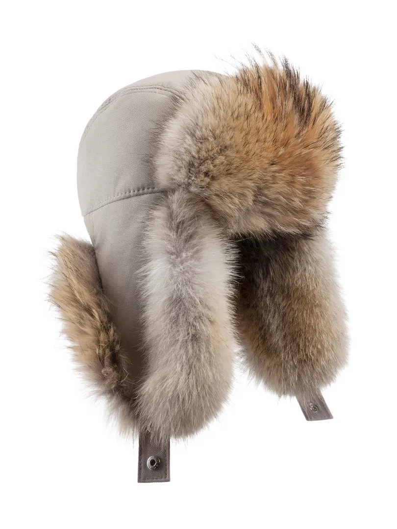 Теплая мужская шапка-ушанка из мембранного материала с отделкой натуральным мехом койота